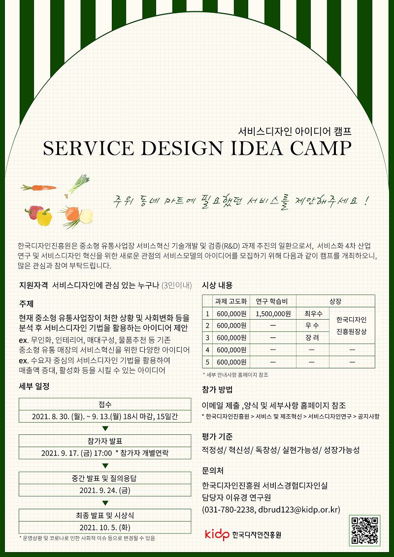 한국디자인진흥원은 중소형 유통사업장 서비스혁신 기술개발 및 검증(R&D) 과제 추진의 일환으로서, 비스화 4차 산업연구 및 서비스디자인 혁신을 위한 새로운 관점의 서비스모델의 아이디어를 모집하고 현장실증 참여 및 교류의 기회를 제공하기 위해 다음과 같이 캠프를 개최하오니, 많은 관심과 참여 부탁드립니다.