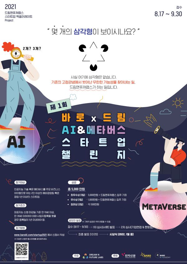 - AI 또는 메타버스를 비즈니스 아이템으로 하는 2인 이상 예비창업팀 혹은 창업 1년 이내 스타트업