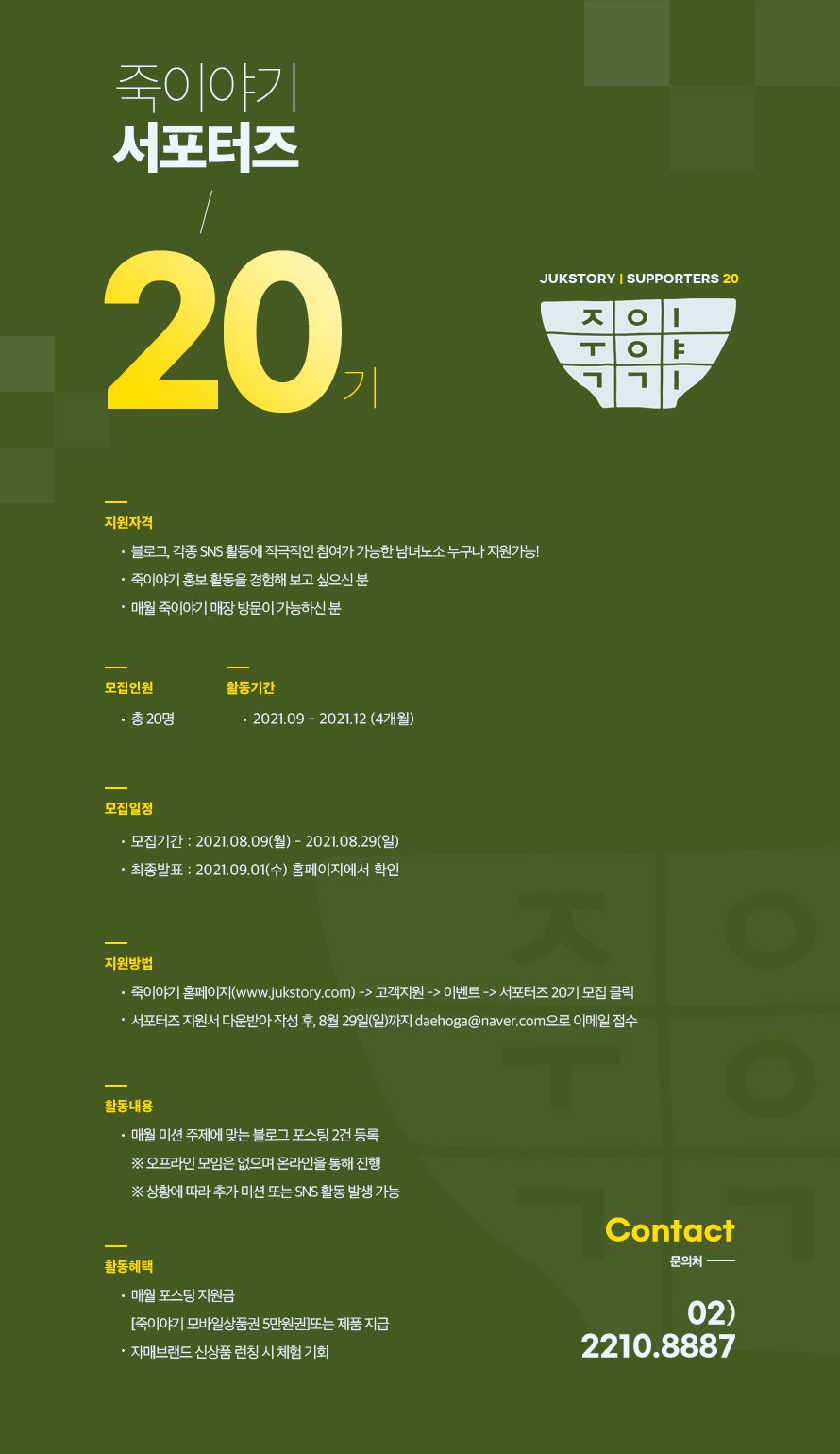 죽이야기의 행복한 맛을 전할 수 있는 기회를 공유하실 서포터즈를 모집합니다.