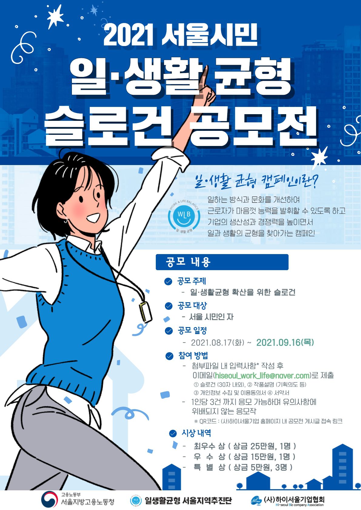 <2021년 서울시민 일·생활 균형 슬로건 공모전>을 실시합니다. 이번 공모전을 통해 일‧생활 균형 정책에 대한 사회적 관심과 이해를 증진시키고 일‧생활 균형 문화 확산을 도모하고자 하니 많은 관심과 참여 바랍니다.