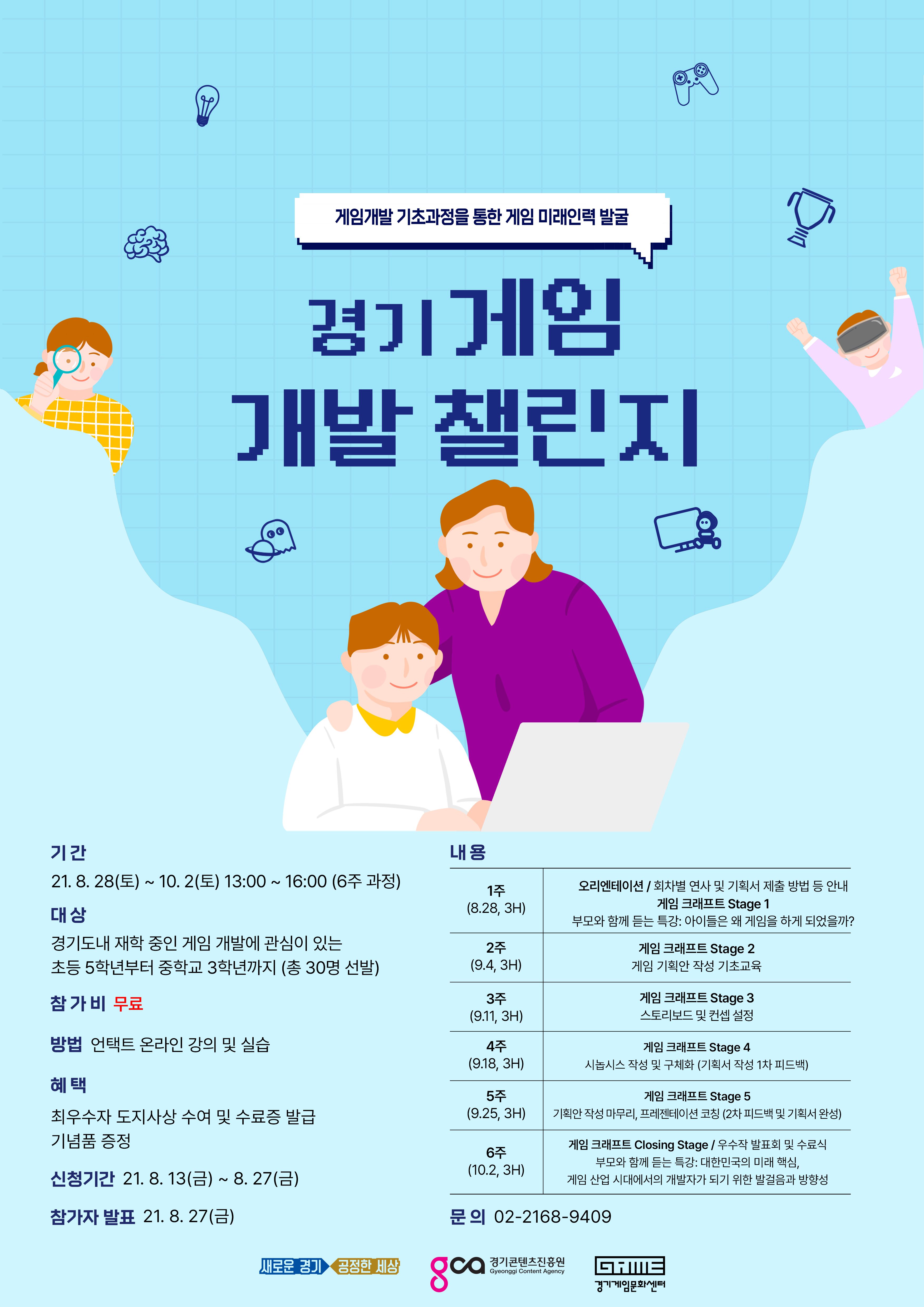 - 경기도내 재학 중인 게임 개발에 관심이 있는 초등 5학년부터 중학교 3학년까지 (총 30명 선발)