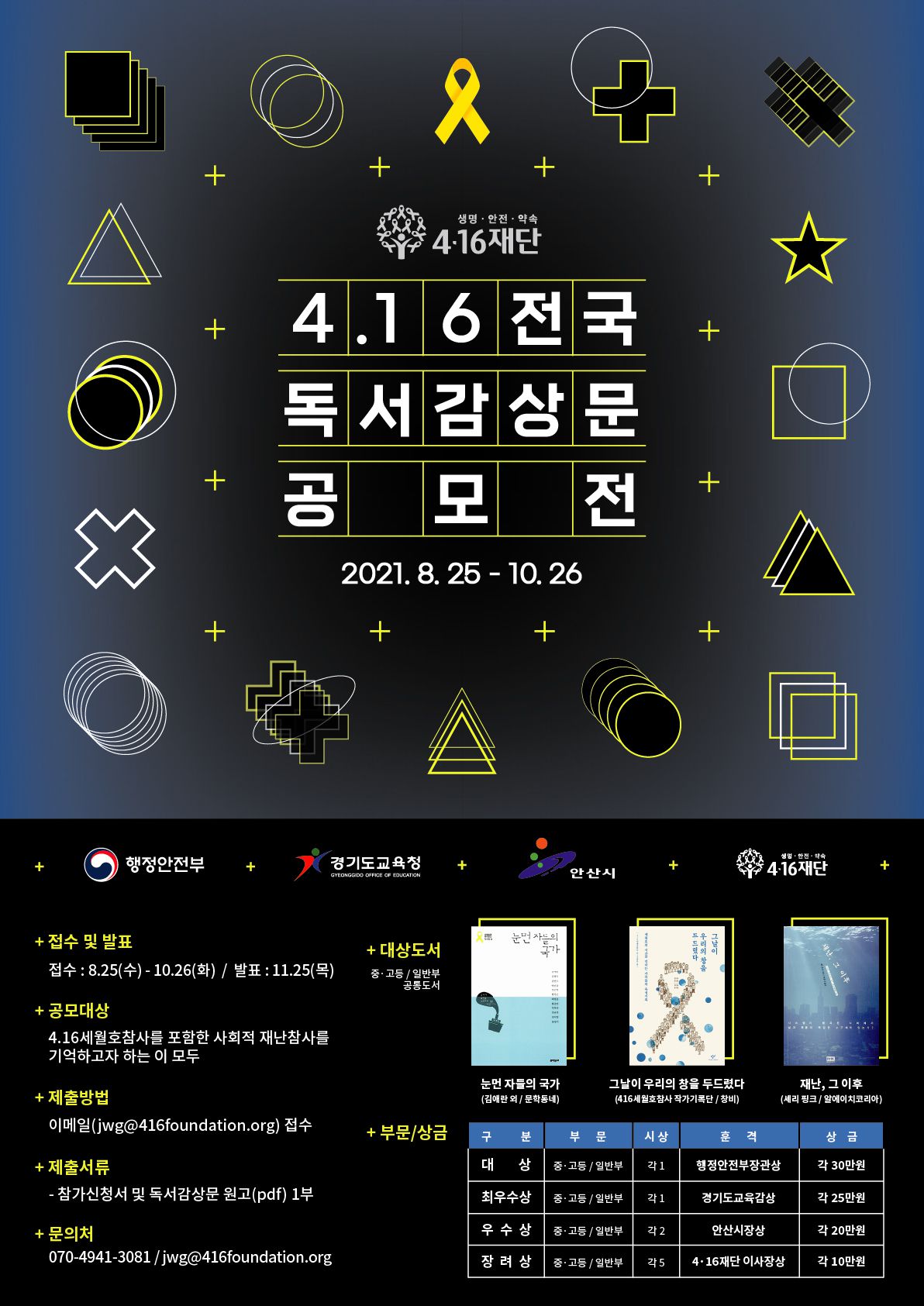 자극적이고 짧은 뉴스나 기사가 아닌 정돈된 글로 4.16세월호참사를 접하고, 사회적 재난참사 전반에 대한 이해의 폭을 넓혀 안전 사회로 향하기 위한 2021 제1회 전국 4.16 독서감상문 공모전을 안내합니다. 많은 관심과 참여 부탁드립니다.