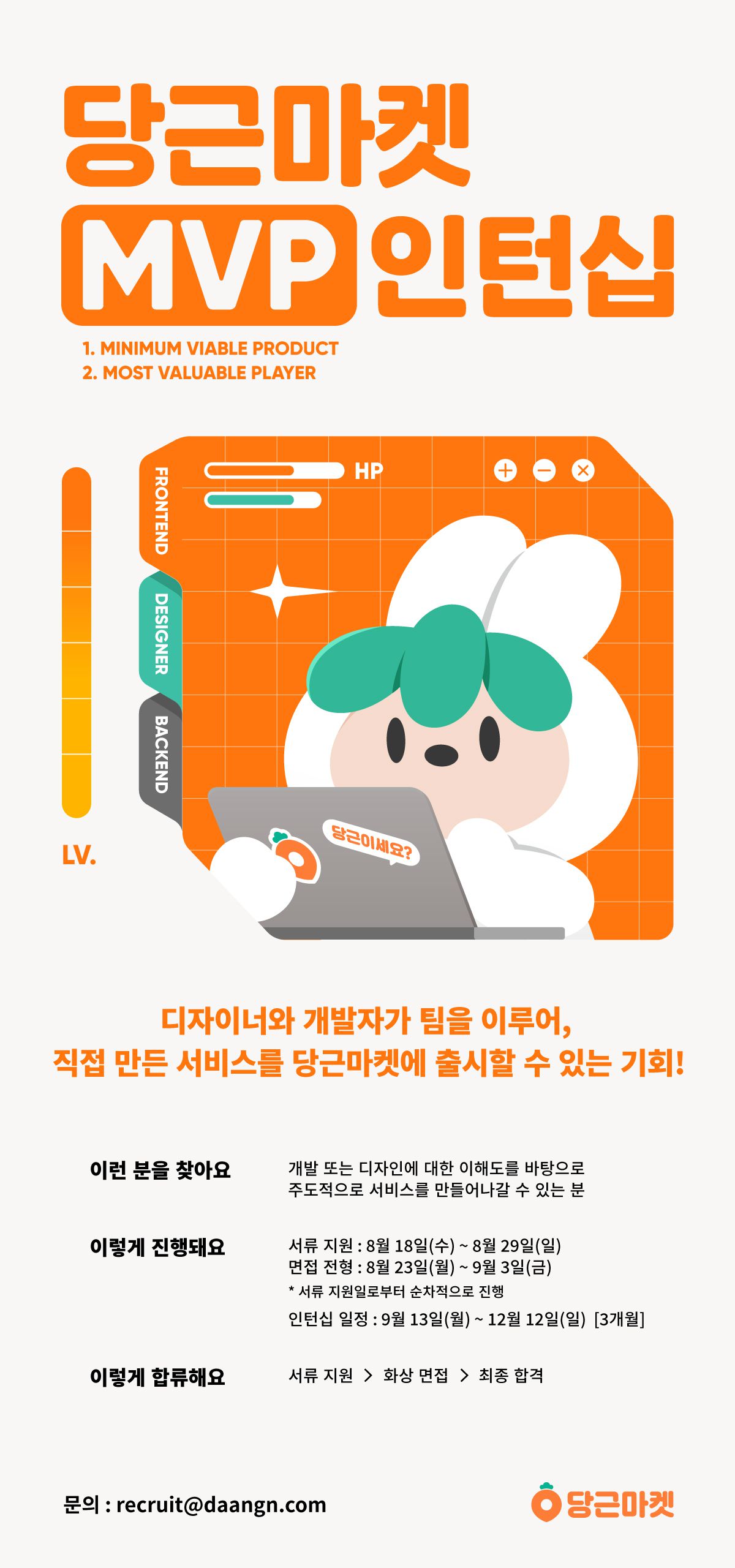 🏆당근마켓 MVP 인턴십🏆은 개발자와 디자이너가 팀을 이루어 직접 서비스를 만들고 당근마켓 앱 내에 실제로 출시할 수 있는 인턴십이에요. 다양한 사람들과 협업하면서 시야를 넓히고 서로 배우며 성장할 수 있어요. 프론트엔드 및 백엔드 개발자, 디자이너를 꿈꾸는 분들과 함께하기를 기대해요.