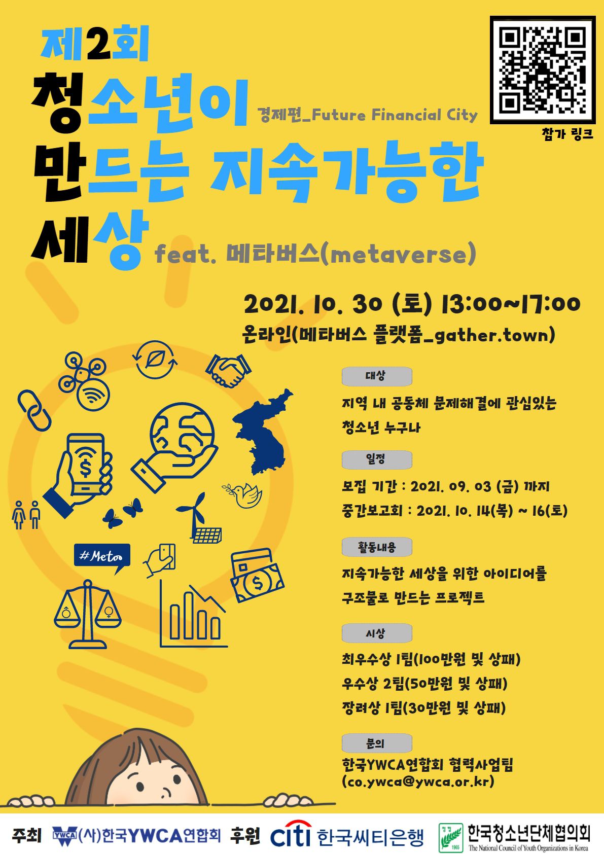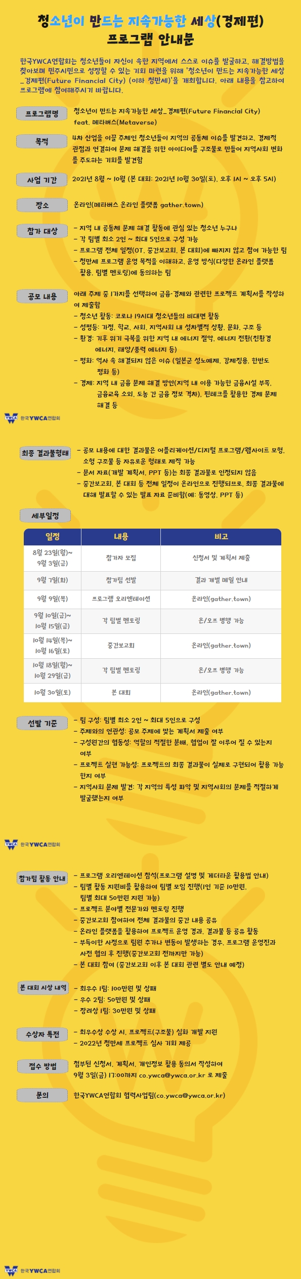 - 접수방법: 참가신청서, 사업계획서, 개인정보활용동의서 작성하여 9월 3일(금) 오후 5시까지 co.ywca@ywca.or.kr 로 제출