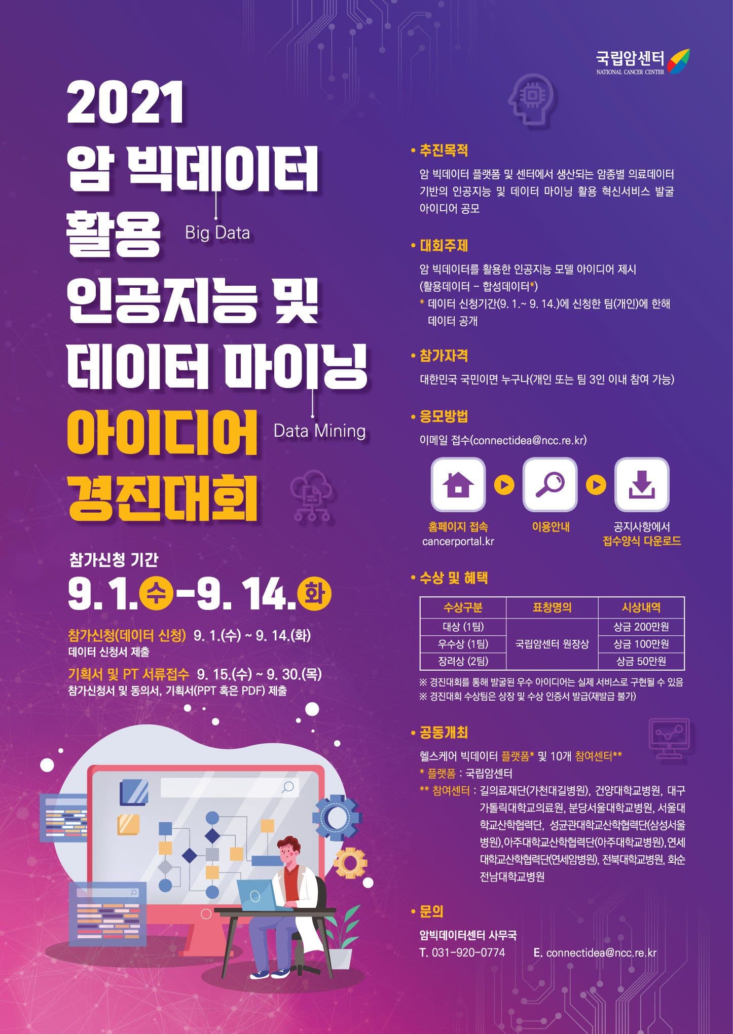 - 암 빅데이터 플랫폼 및 센터에서 생산되는 암종별 의료데이터 기반의 인공지능 및 데이터 마이닝 활용 혁신서비스 발굴 아이디어 공모