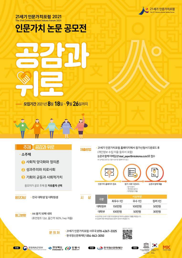 21세기 인문가치포럼에서 차세대 인문학자 발굴을 위해 <공감과 위로>를 주제로 논문을 공모합니다.