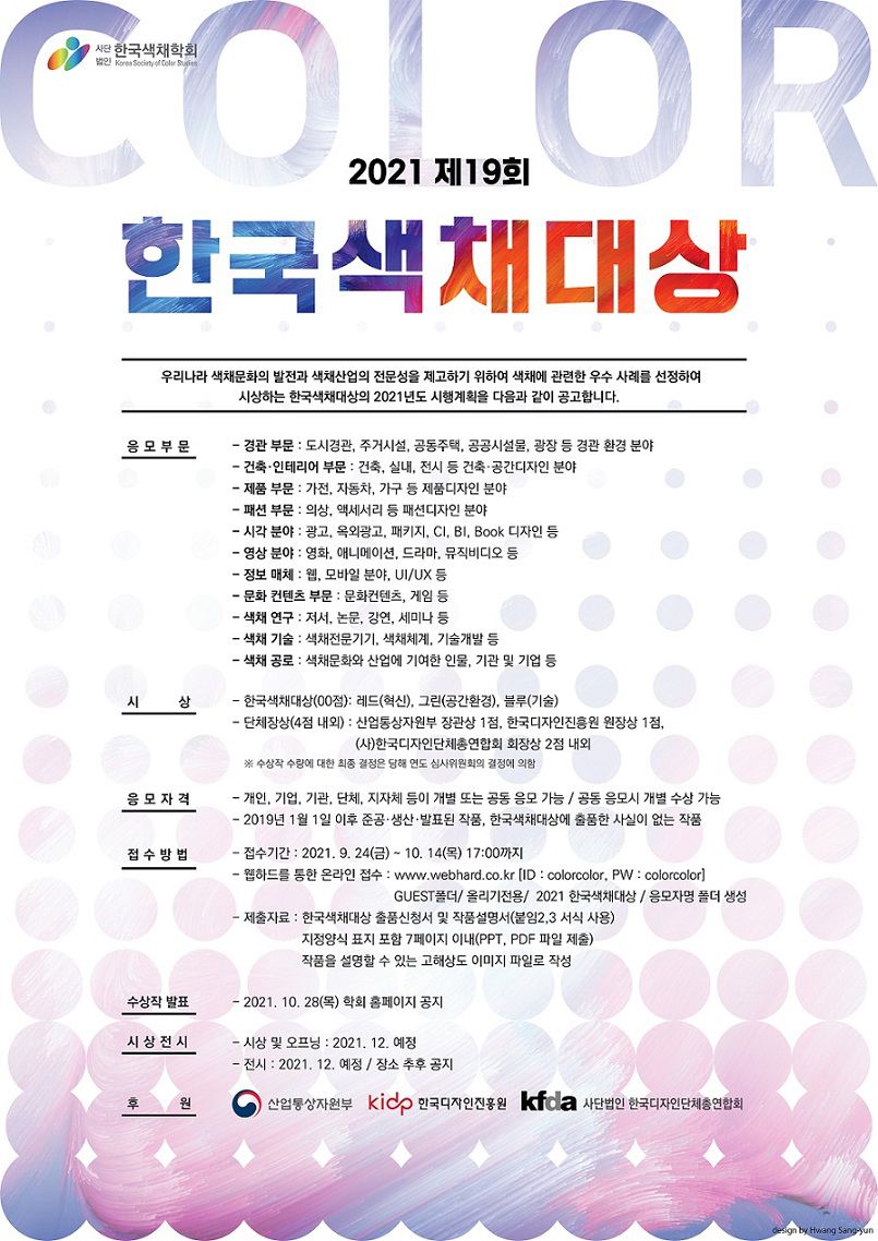 - 수상작에는 (사)한국색채학회가 인증하는 색채대상 마크 사용권 부여