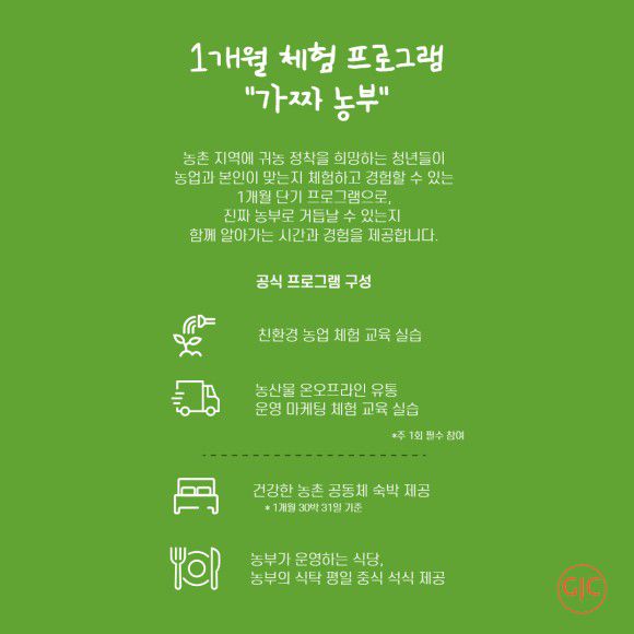 귀농 정착을 희망하는 청년들을 대상으로 운영하는 '청년 귀농의 정석' 프로그램 중 '가짜 농부' 프로그램은 실제 귀농귀촌에 관심이 있는 청년들이 농촌 생활을 경험하고 체험하며 본인이 귀농 생활과 맞는지 알아볼 수 있는 1개월 단기 체험 프로그램입니다 :-)