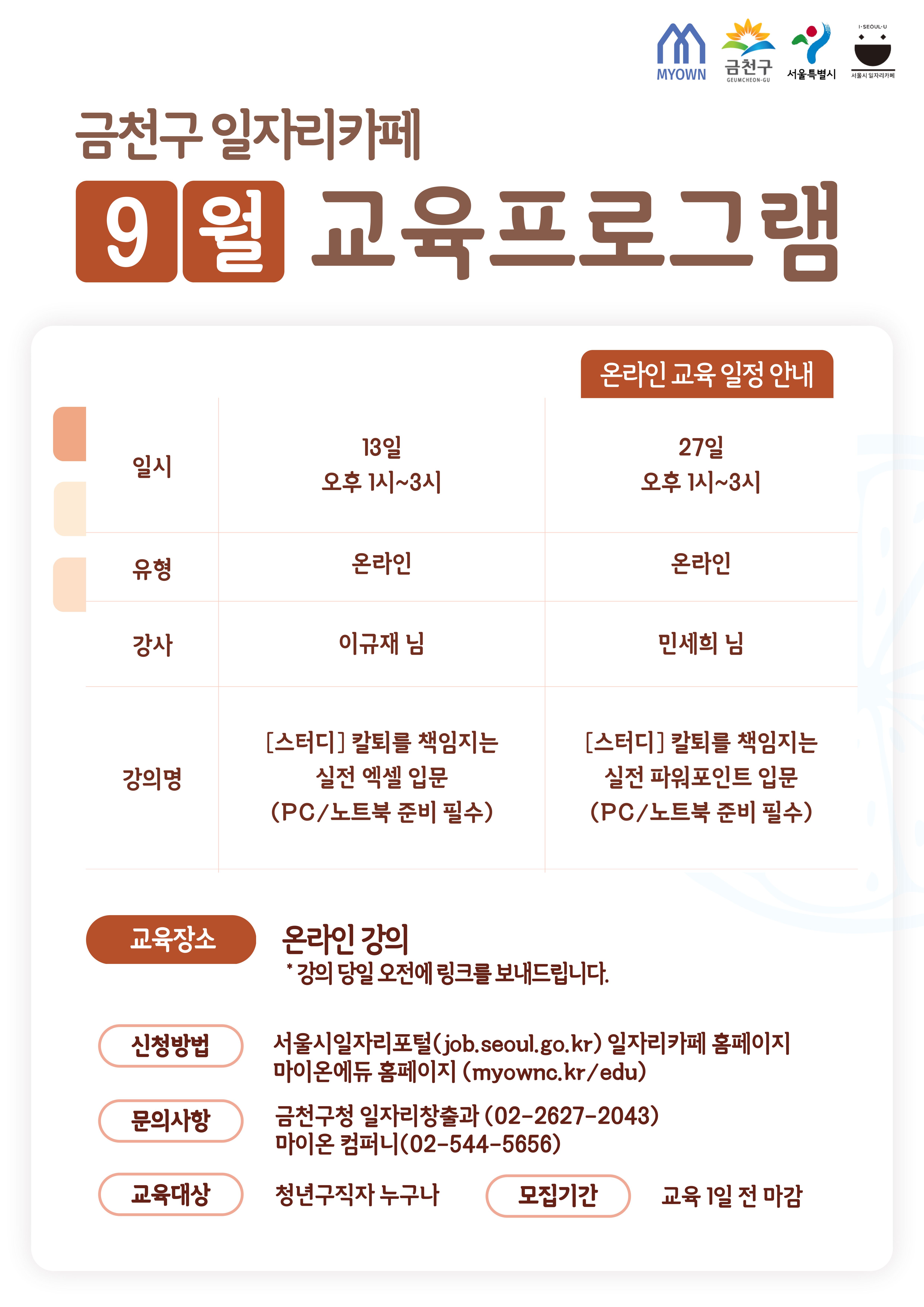 👉 문의사항: 1) 금천구 일자리창출과 02-2627-2043 / 2) 마이온 에듀 02-544-5656