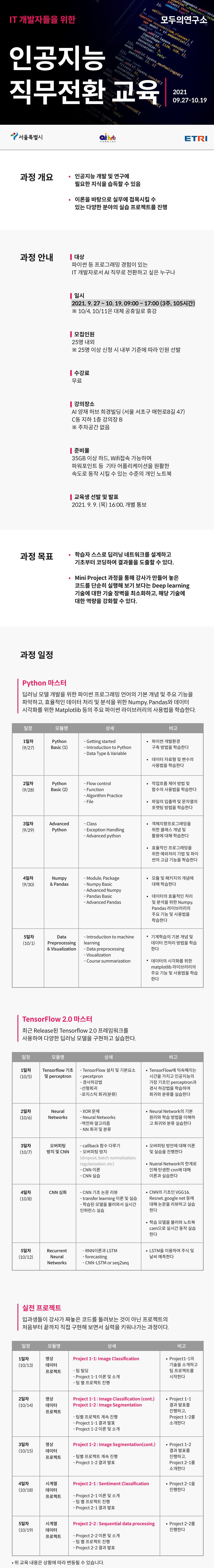 - 일시: 2021. 9. 27 ~ 10. 19 , 09:00 ~ 17:00 (3주, 105시간)