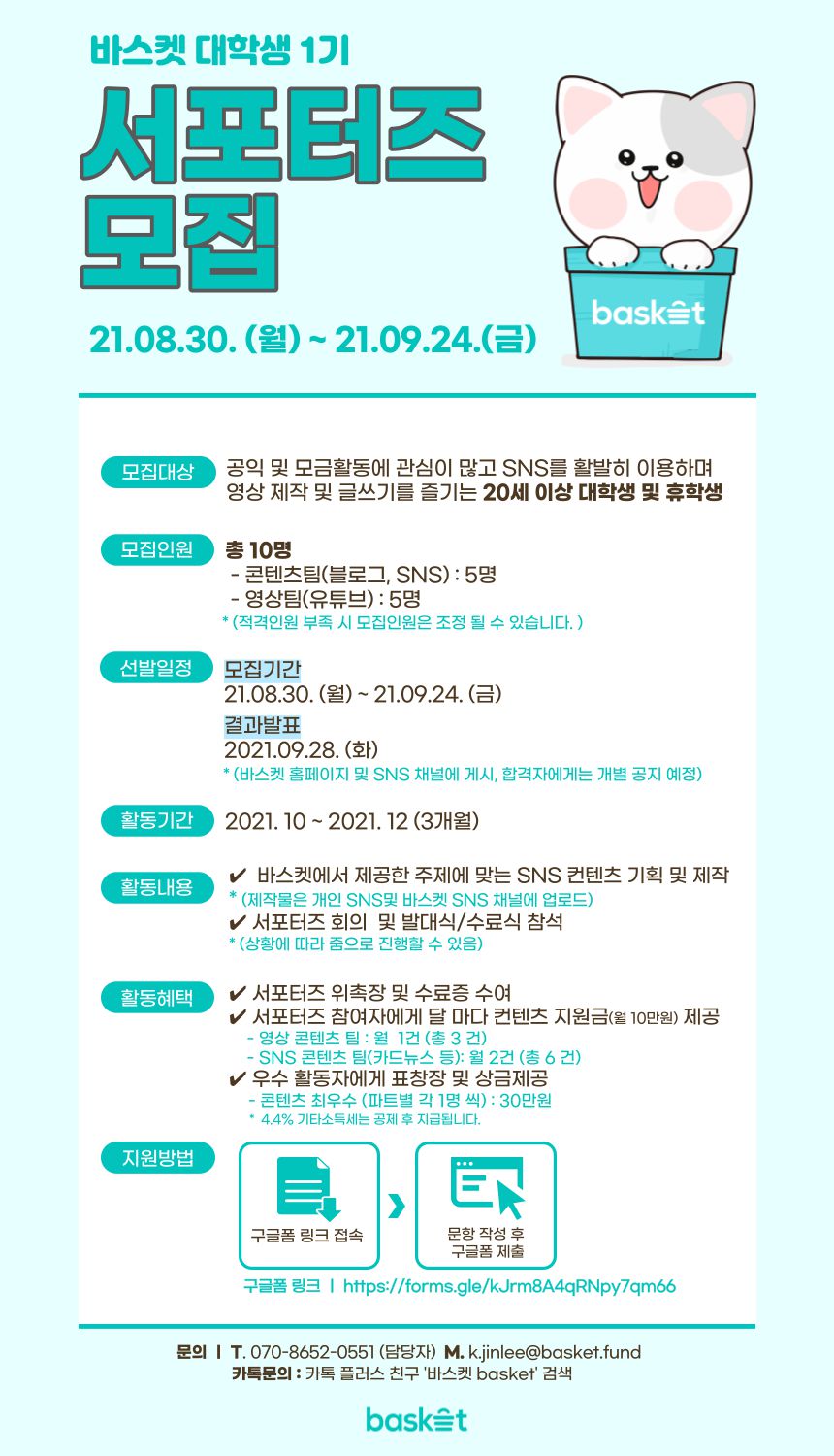 3개월 동안 바스켓과 함께 하실 바스켓 대학생 서포터즈를 모집합니다.