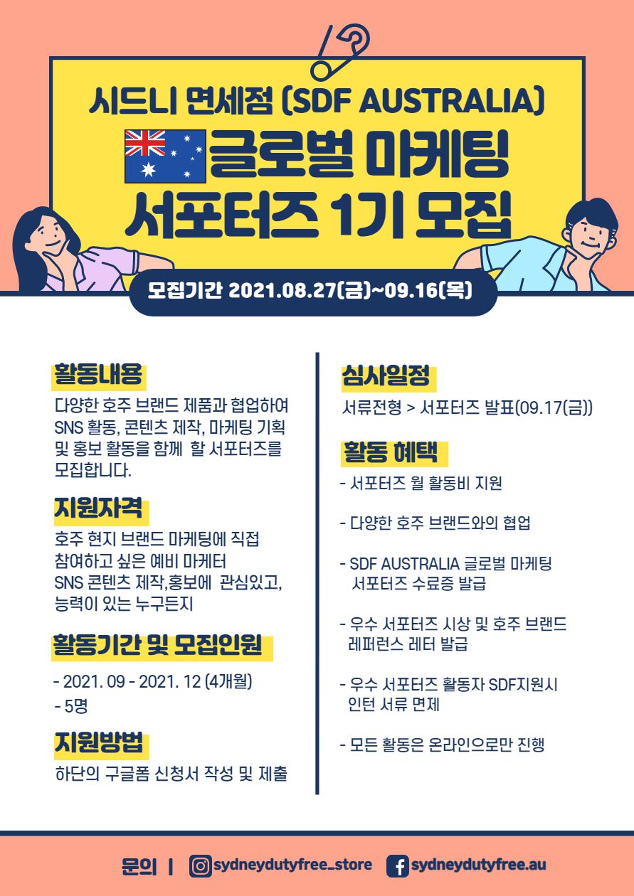 SDF 시드니 면세점 글로벌 마케팅 서포터즈 1기 모집 (~09. 16)