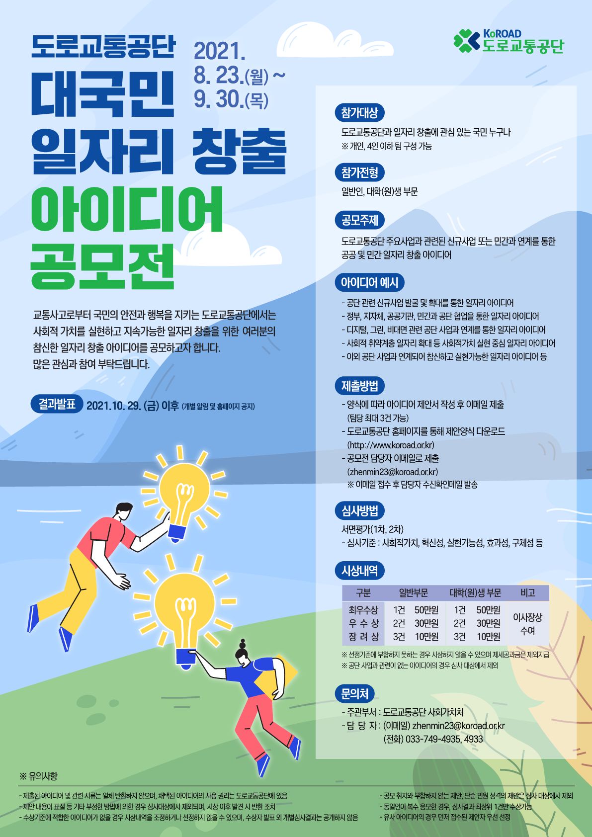 일자리 창출 아이디어 공모전 담당자(033-749-4935, 4933) 및 담당자 이메일(zhenmin23@koroad.or.kr)