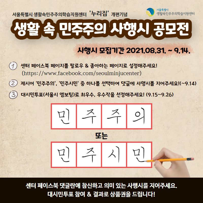 - 본 생활 속 민주주의 사행시 공모전은 [서울특별시 생활속민주주의학습지원센터] 페이스북 페이지 사행시 공모전 게시물 댓글을 통해서만 받습니다.