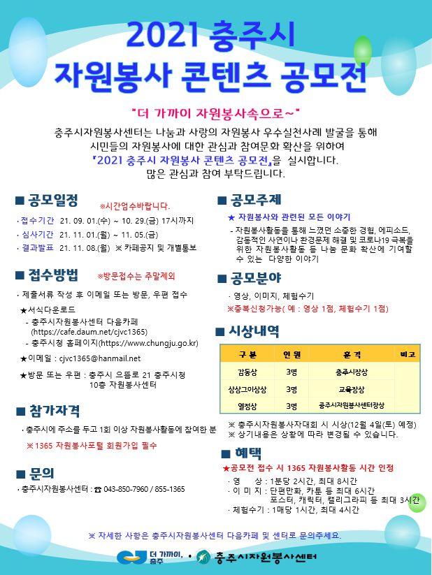 『2021 충주시 자원봉사 콘텐츠 공모전』에 많은 관심과 참여 바랍니다.