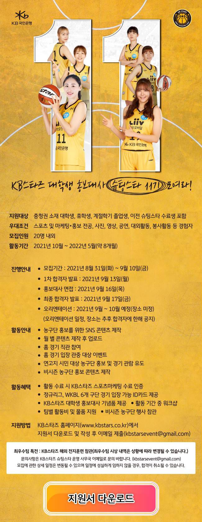 KB스타즈 홈페이지(http://www.kbstars.co.kr/)에서 지원서 다운로드 및 작성 후 이메일 제출(kbstarsevent@gmail.com)