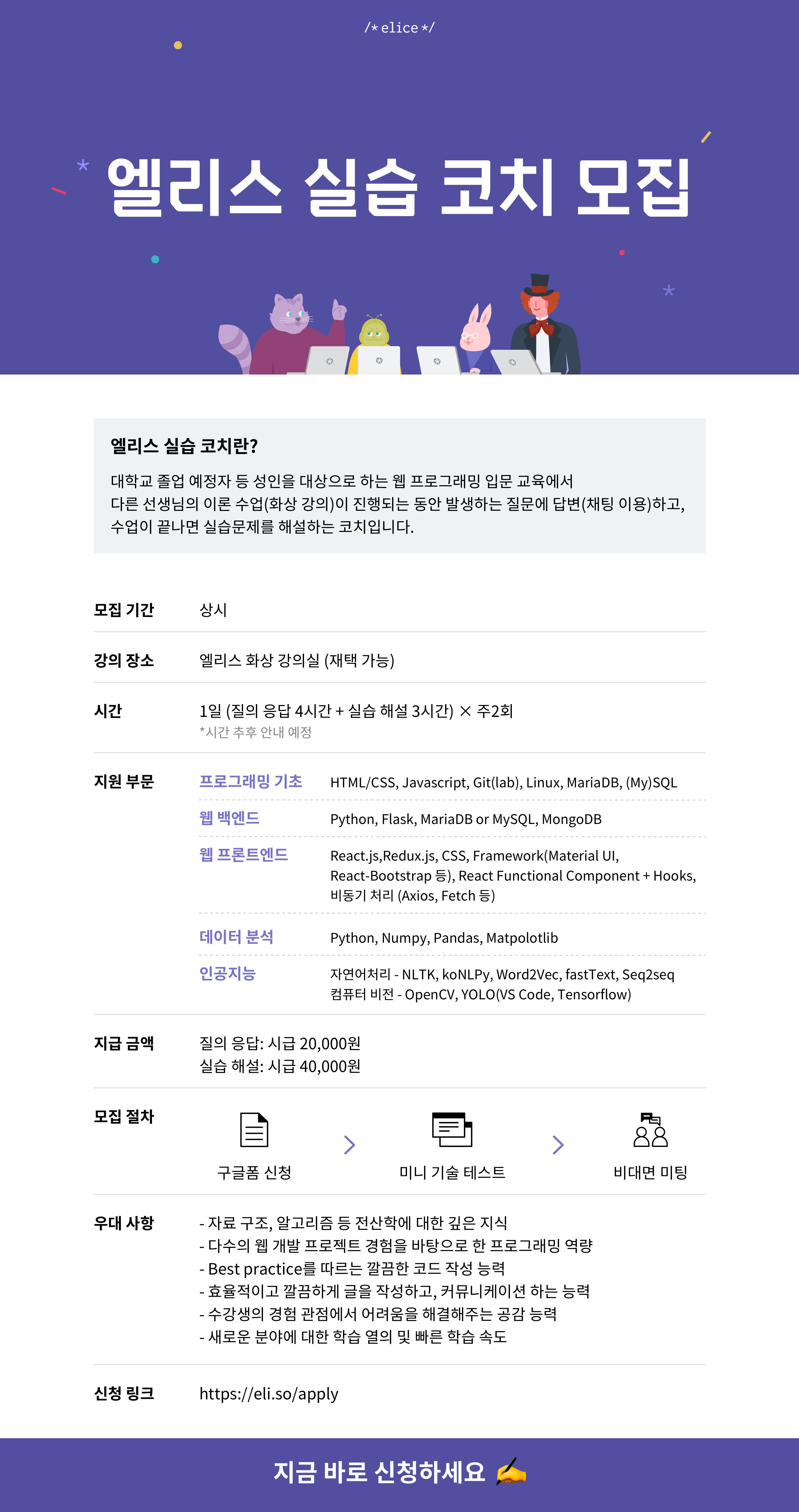 대학교 졸업 예정자 등 성인을 대상으로 하는 웹 프로그래밍 입문 교육에서 다른 선생님의 이론 수업(화상 강의)이 진행되는 동안 발생하는 질문에 답변(채팅 이용)하고, 수업이 끝나면 실습문제를 해설하는 코치입니다.