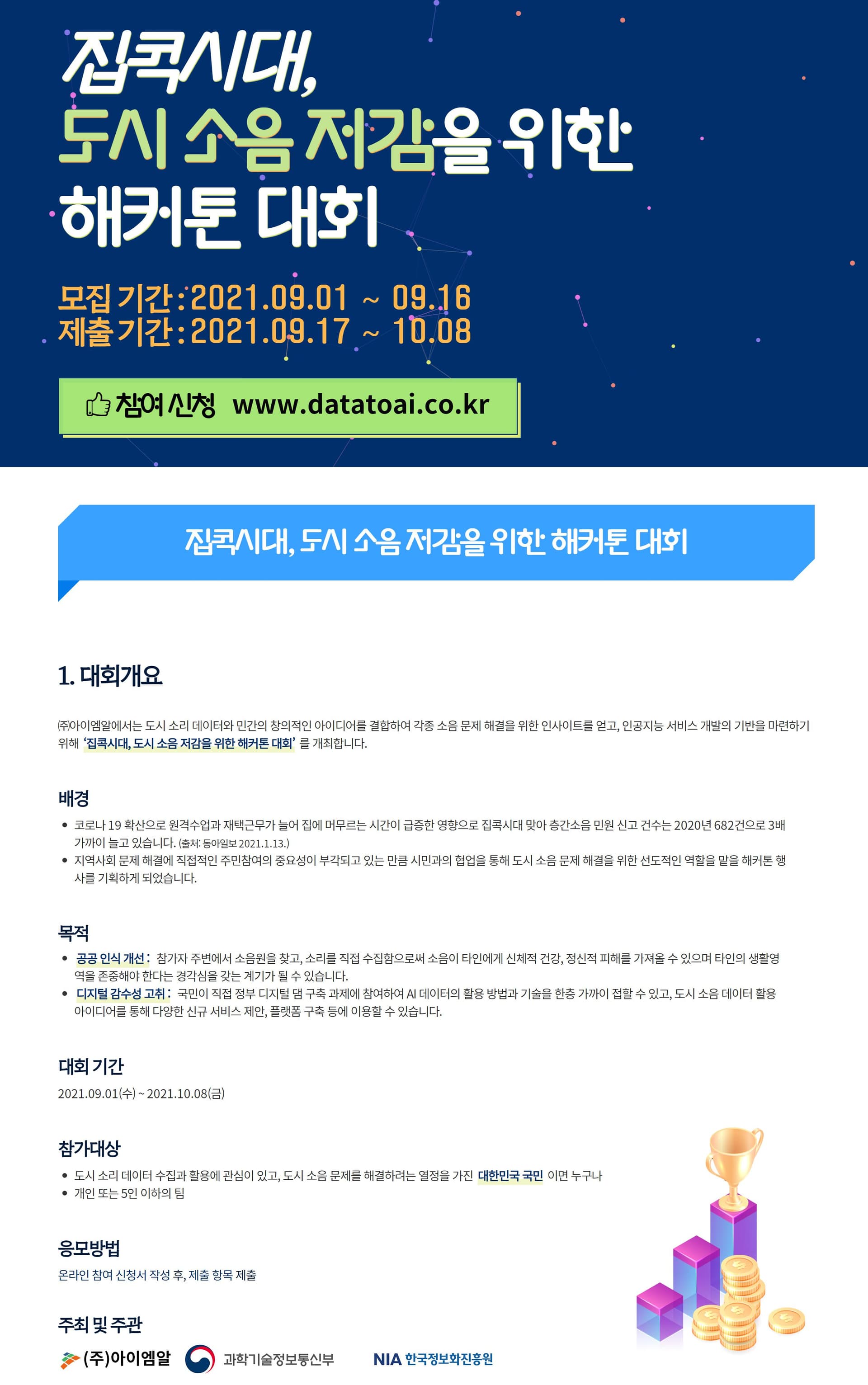㈜아이엠알에서는 도시 소리 데이터와 민간의 창의적인 아이디어를 결합하여 각종 소음 문제 해결을 위한 인사이트를 얻고, 인공지능 서비스 개발의 기반을 마련하기 위해 ‘집콕시대, 도시 소음 저감을 위한 해커톤 대회’를 개최합니다.