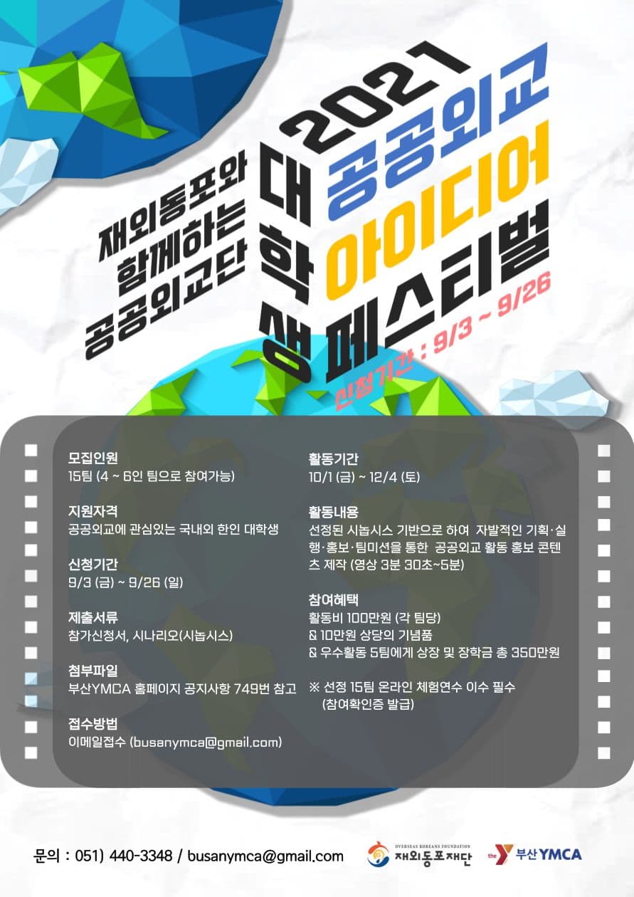 재외동포재단과 부산YMCA는 공공외교에 대한 대학생들의 관심을 증대시키고 이를 통해 세계한인 차세대 네트워크의 기반을 마련하고자 합니다. 또한 재외동포와 함께 하는 공공외교 강화에 기여하기 위해 「재외동포와 함께하는 공공외교단 –2021 대학생 공공외교 아이디어 페스티벌-」을 모집하고자 합니다. 국내외 한인 대학생들의 많은 참여 바랍니다.