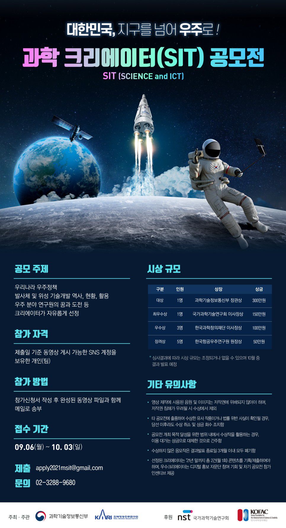 이번 공모전의 주제는 우주이며, 한국형 발사체 누리호 발사(10.21 예정), 한국형위성항법시스템(KPS*) 개발 등 우주 정책 및 연구개발 사업에 대한 국민적 관심을 높이기 위해 마련되었습니다.