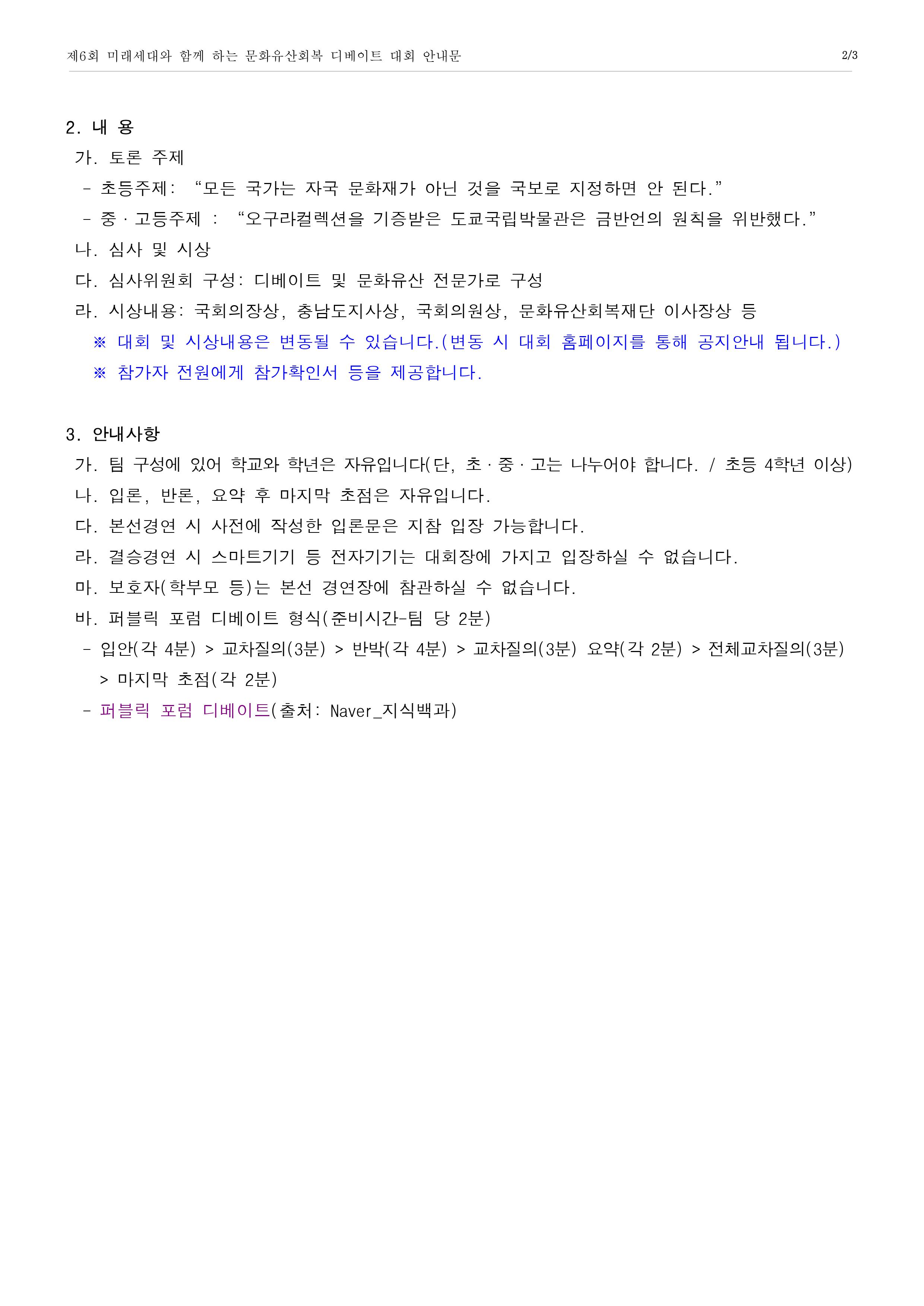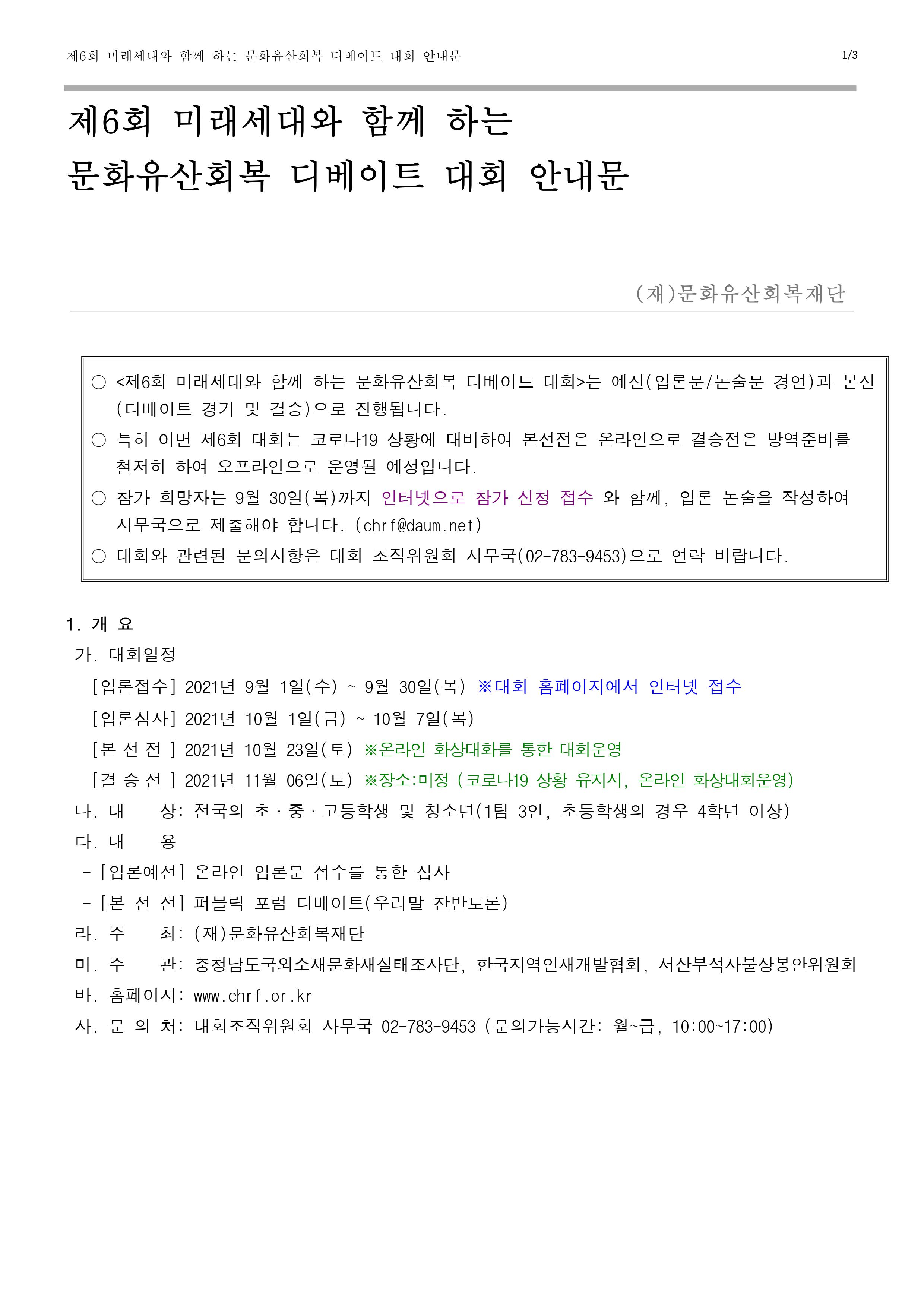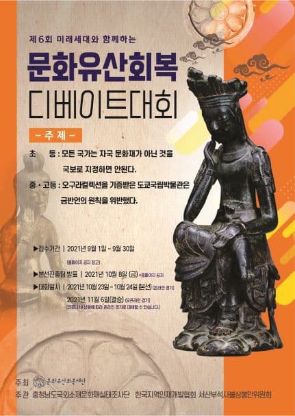 <제6회 미래세대와 함께 하는 문화유산회복 디베이트 대회>는 예선(입론문/논술문 경연)과 본선(디베이트 경기 및 결승)으로 진행됩니다.