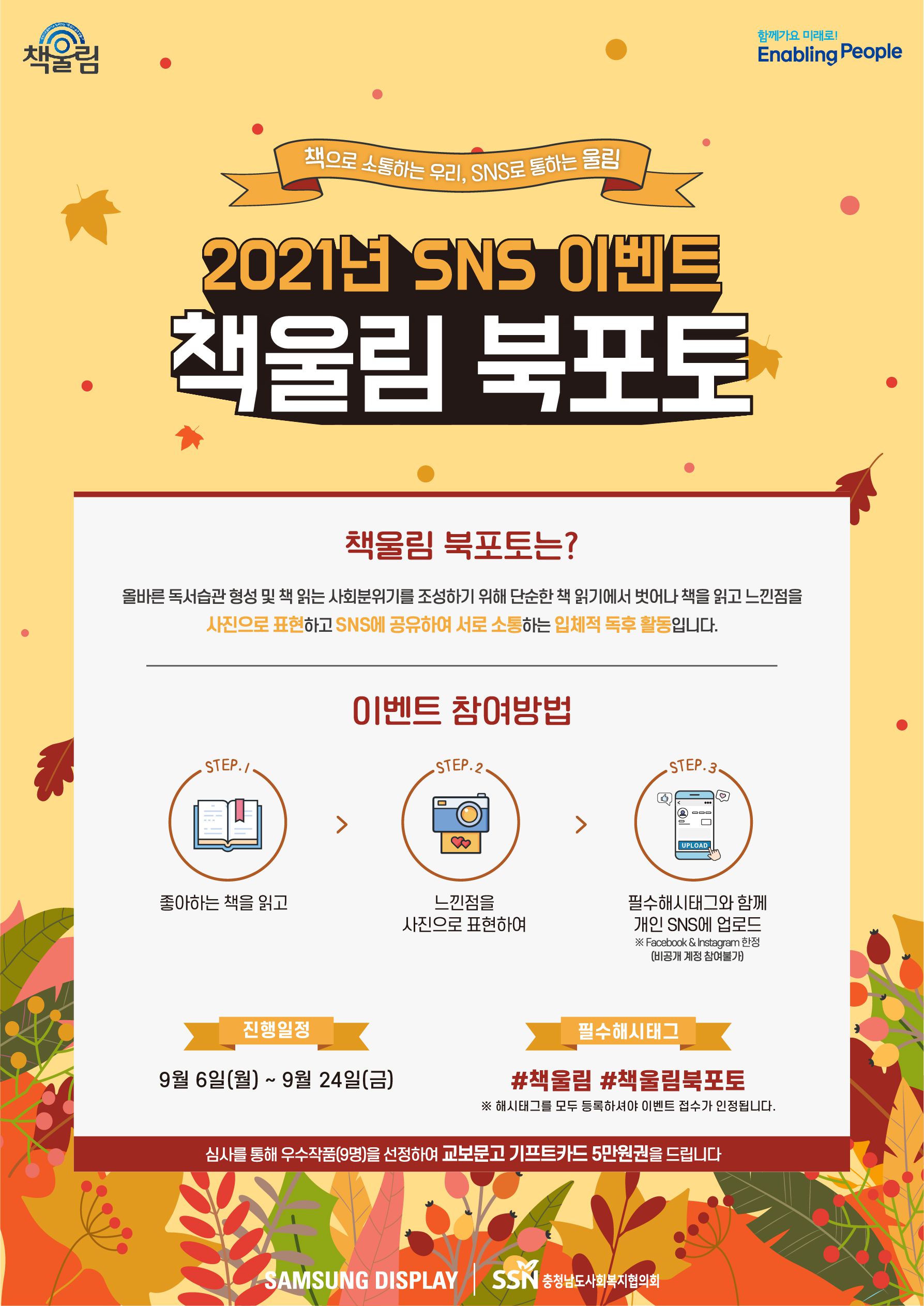 - 책을 읽고 느낀점을 '사진'으로 표현하고 '필수해시태그'를 포함하여 개인 SNS에 업로드