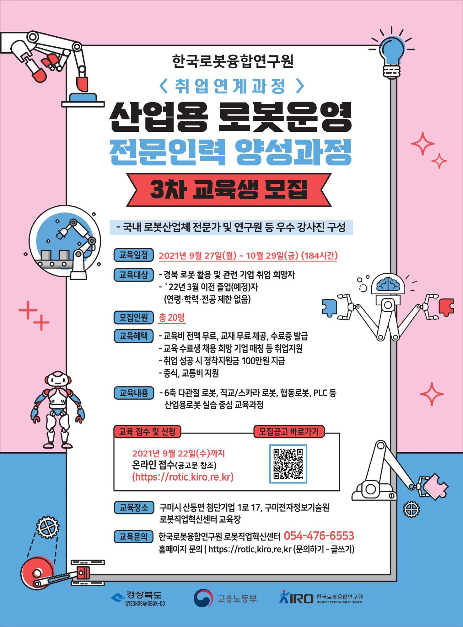 국내 유일의 정부산하 로봇 전문생산기술연구소 ‘한국로봇융합연구원’에서 2021년도 산업용 로봇 운영 전문인력 양성과정 교육생을 모집합니다. 동 교육과정은 국내 대학 현직교수 및 국내 로봇기업의 실무자가 직접 강의 및 실습을 제공하며 교육 이수 이후 취업지원까지 연계되는 과정입니다. 관심이 있는 분은 아래 모집 안내를 확인 후, 지원 바랍니다.