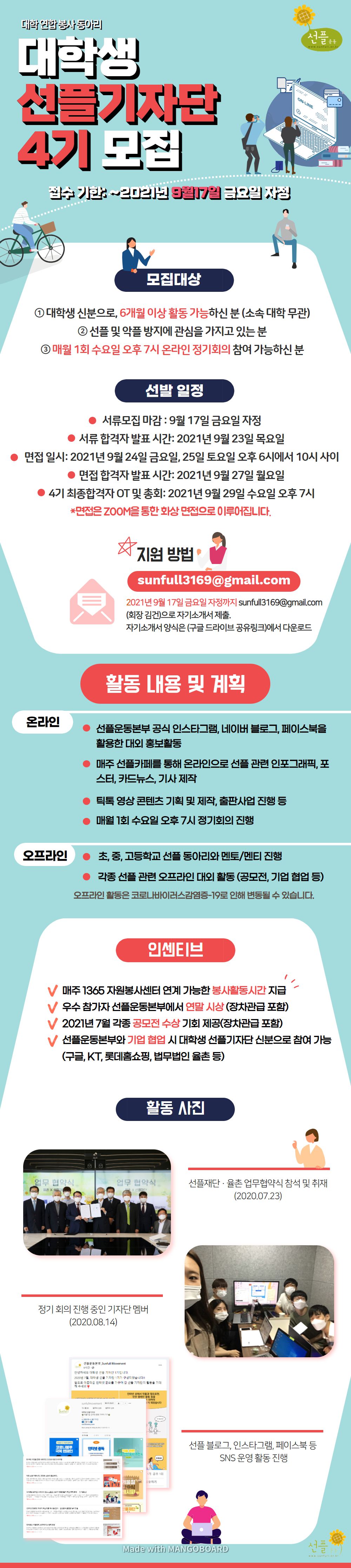 sunfull3169@gmail.com (회장 김 건)으로 지원서 제출
