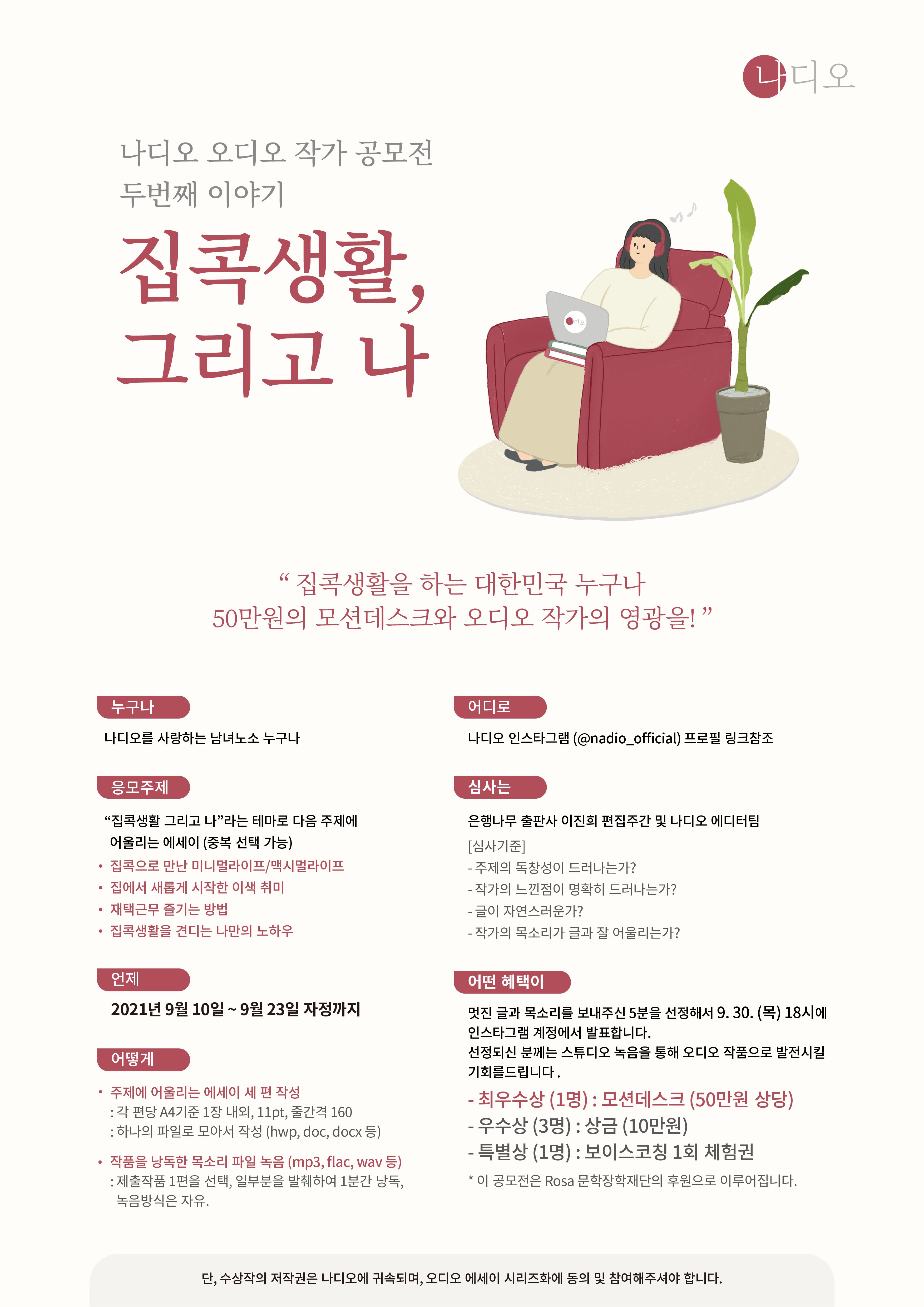 힐링 오디오 에세이 플랫폼 나디오에서 <집콕생활, 그리고 나> 공모전을 개최합니다. 나디오는 좋은 글을 작가의 목소리로 담아내는 힐링 오디오 플랫폼입니다. 집 밖에 나가기 쉽지 않은 요즘, 여러분들만의 특별한 '집콕생활' 이야기를 들려주세요. 이번 공모전은 Rosa 문학장학기금과 함께합니다.