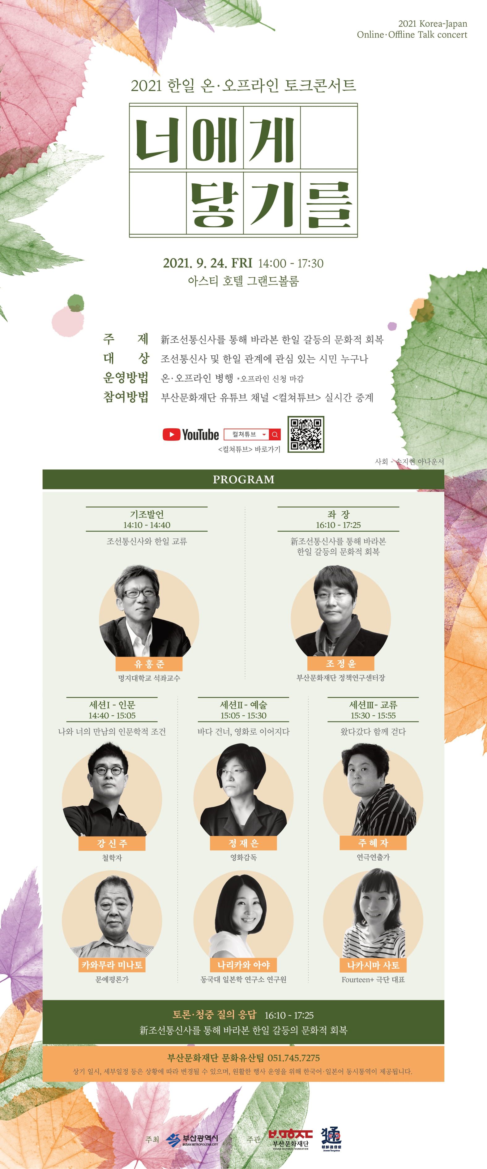 안녕하세요. 오는 9월 24일 '2021 한일 온오프라인 토크콘서트 <너에게 닿기를>'을 개최합니다.