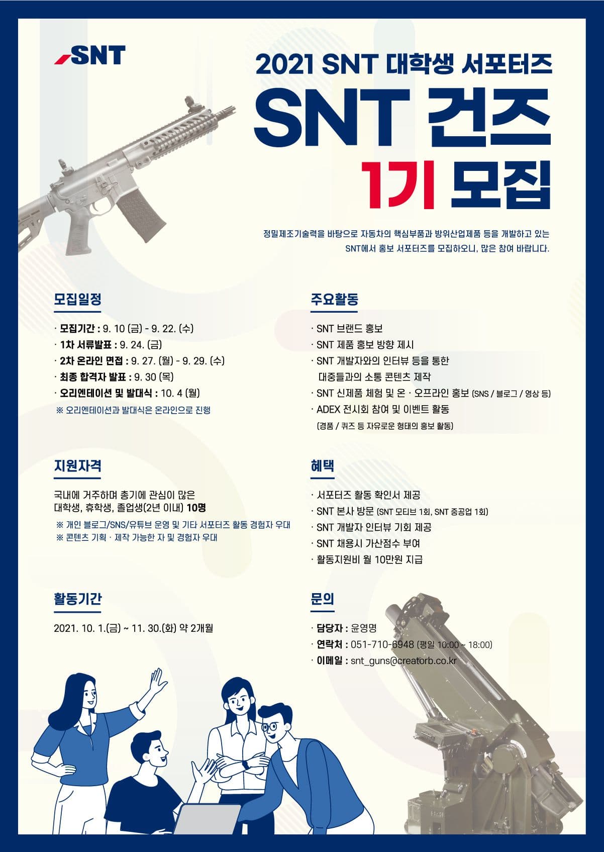 SNT그룹은 대한민국 방위산업분야에서 군용 파워트레인과 화기류를 생산하며 중추적인 역할을 하고 있는 기업입니다. 대중들과의 소통을 통한 SNT 브랜드 홍보 및 신제품 홍보, SNT 방위산업 전시회 홍보 등을 위한 대학생 서포터즈를 모집하오니, 많은 참여 바랍니다.