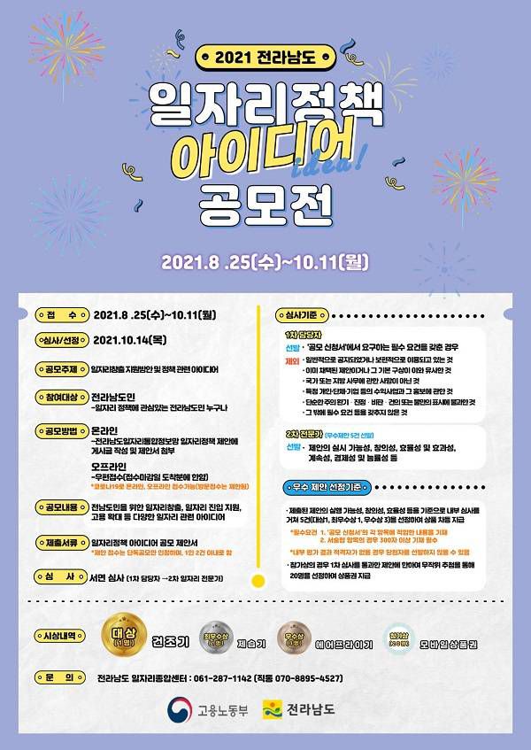 -공모내용: 전남도민을 위한 일자리창출, 일자리 진입지원 고용확대 등 다양한 일자리 관련 아이디어