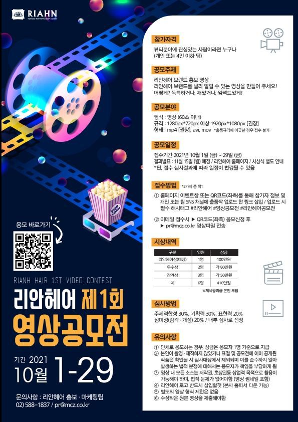 ① 홈페이지 이벤트 창 또는 아래 링크, qr코드를 통해 참가자 정보 및 개인 또는 sns 채널에 출품작 업로드 한 링크 삽입/ 업로드시 필수 해시태그 #리안헤어 #영상공모전 #리안헤어공모전