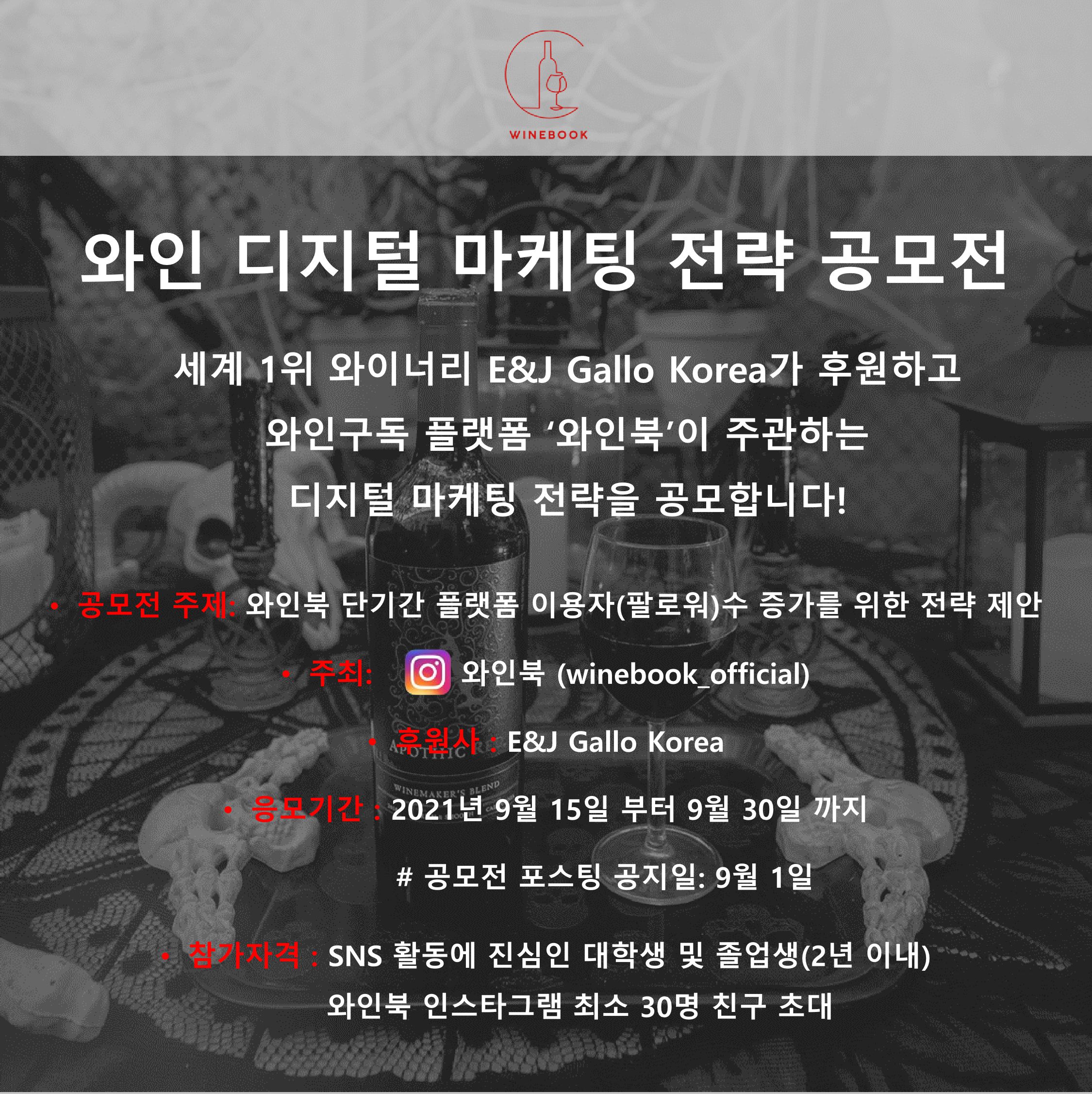 세계 1위 와이너리 E & J Gallo Korea가 후원하고 와인구독 플랫폼 ‘와인북’이 주관하는 디지털 마케팅 전략을 공모합니다!