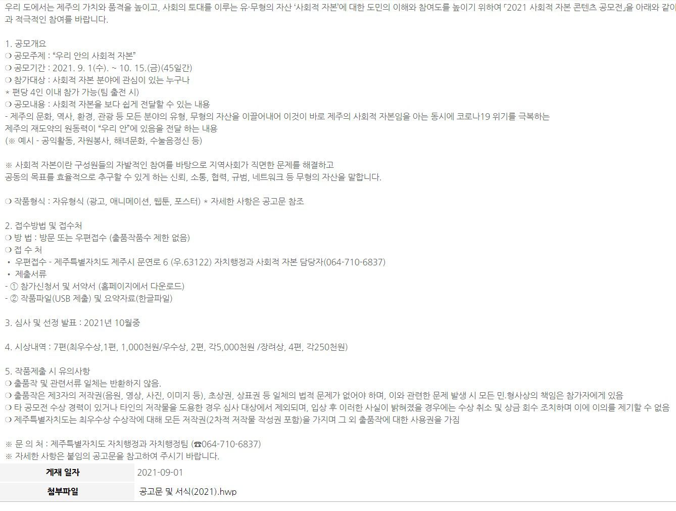 - 수상작 발표 : 2021. 10월 중 (개별통보 및 도 홈페이지 공지)