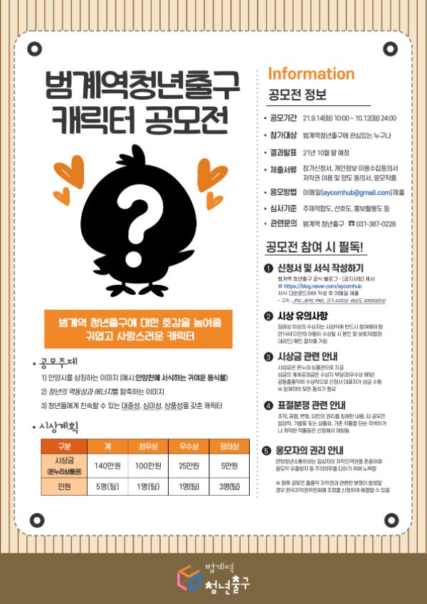 안양청년소통허브에서 안양시 청년공간 범계역 청년출구와 각종 청년지원사업을 보다 친근하게 홍보하고자 안양시 청년공간 범계역 청년출구 캐릭터 공모전을 다음과 같이 개최하오니, 많은 관심과 참여를 부탁드립니다.