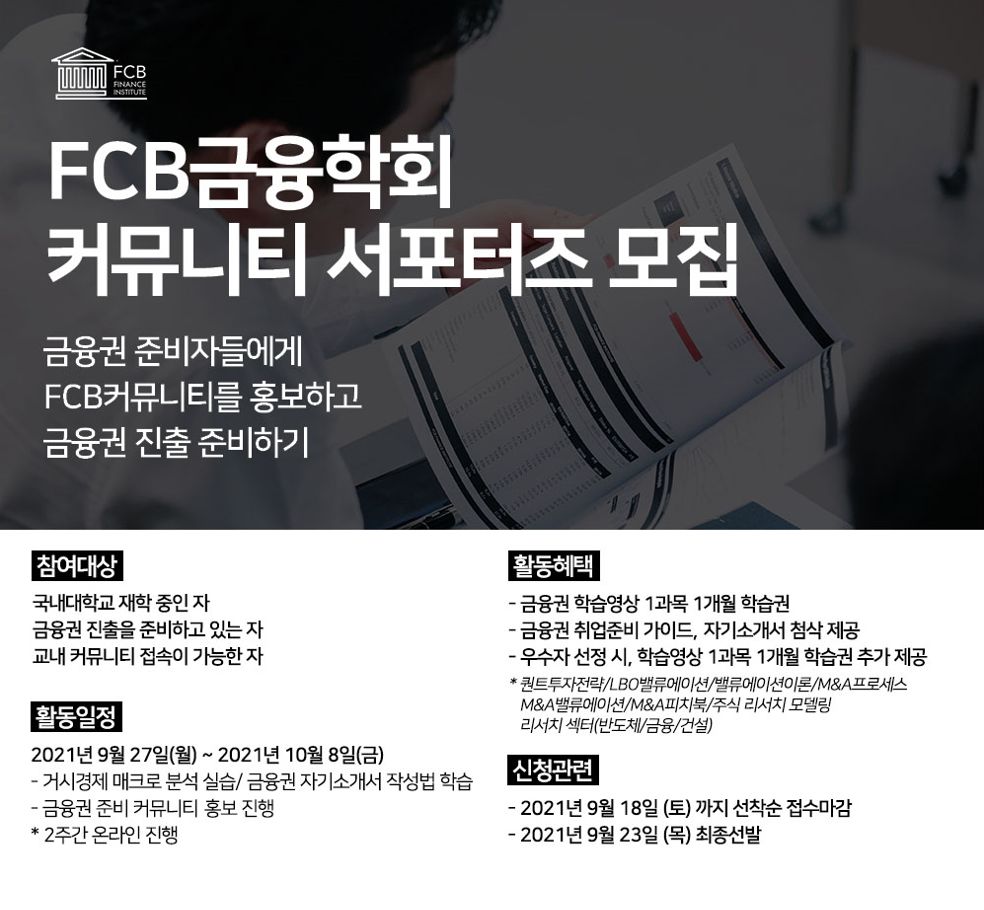 활동명 : FCB금융학회 금융권 하반기 공채 준비 및 자기소개서 작성법 학습을 위한 FCB 서포터즈 2기 모집 ~ 9/18