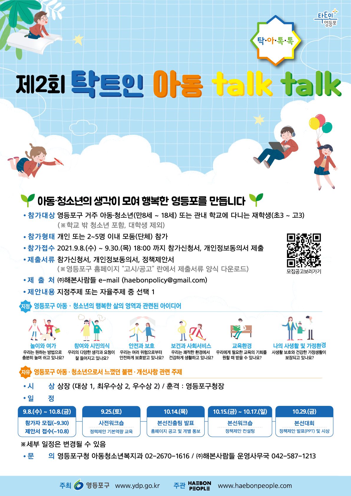 아동·청소년의 정책 창안 능력을 향상시키고 아동의 삶과 영등포구를 변화시킬 정책을 발굴하고자 제2회 탁트인 아동 talk talk 참가자를 모집합니다.