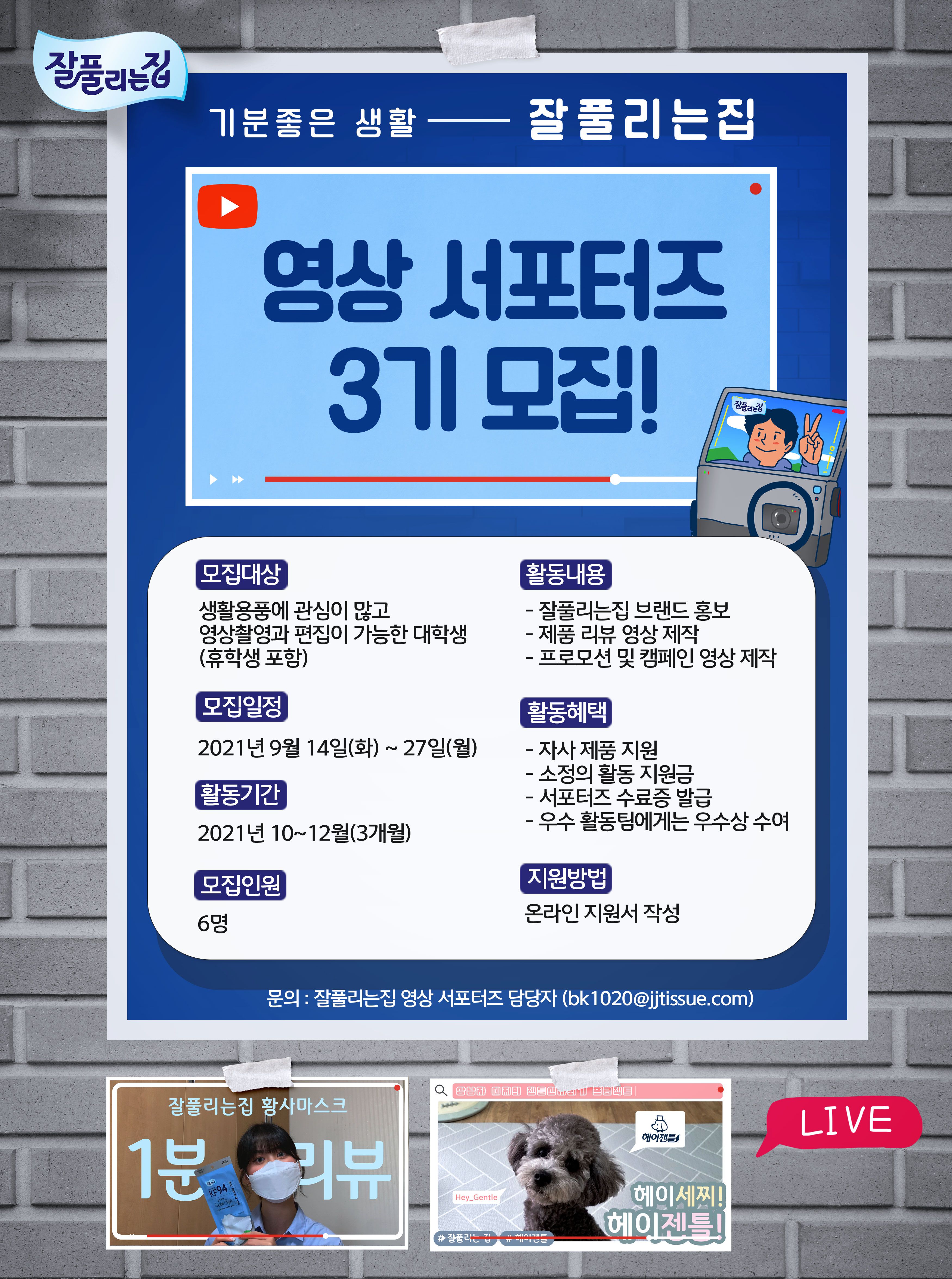 * 문의 : 잘풀리는집 영상 서포터즈 담당자 (bk1020@jjtissue.com)