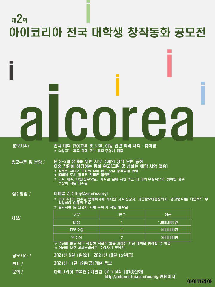 아이코리아에서는 유아교육 및 아동, 보육 관련 학과 대학생을 대상으로 공모전을 실시합니다.