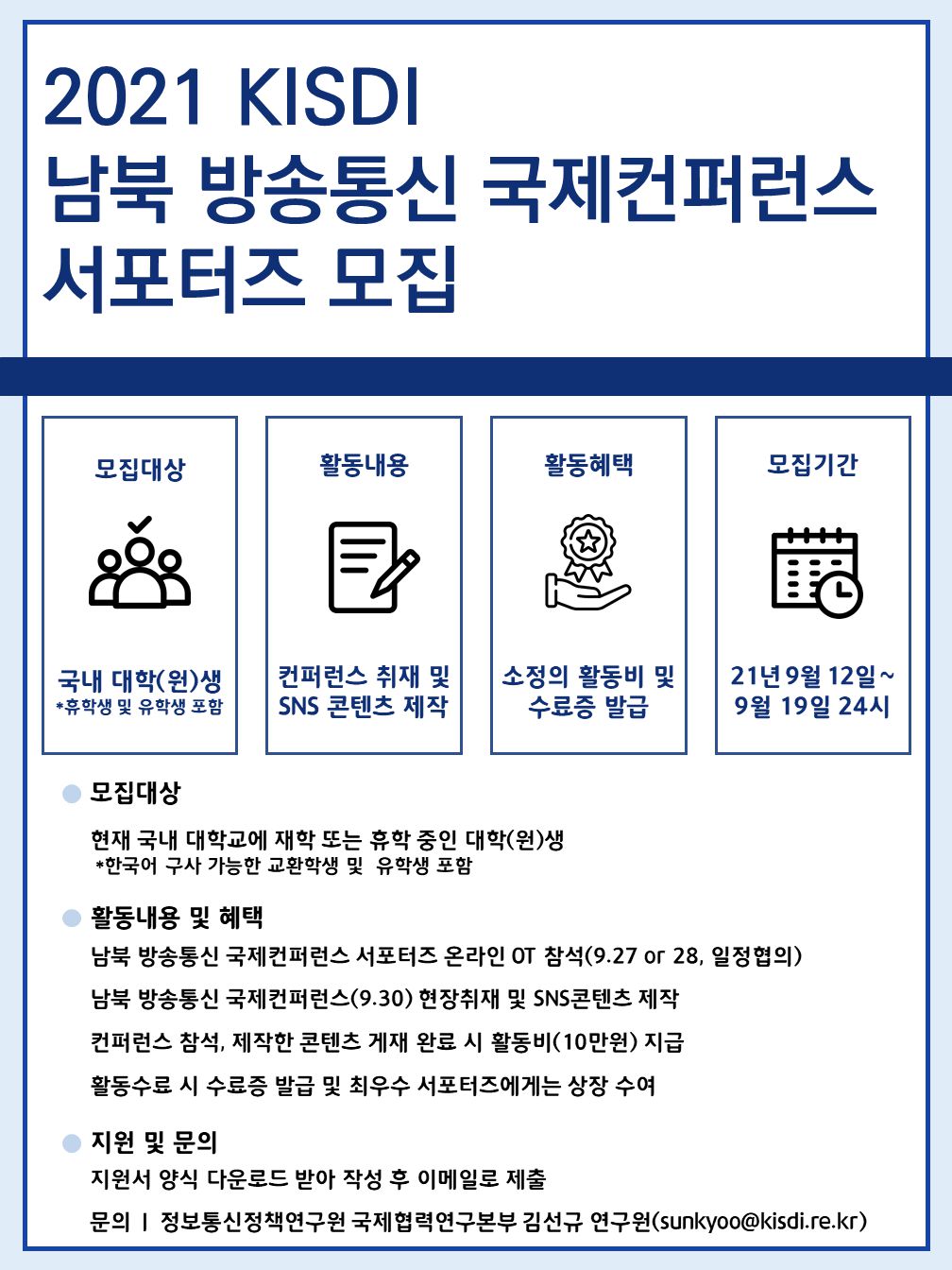 국무조정실 산하 국책연구기관인 정보통신정책연구원(KISDI)에서 <남북 방송통신 국제컨퍼런스 서포터즈>를 모집합니다.