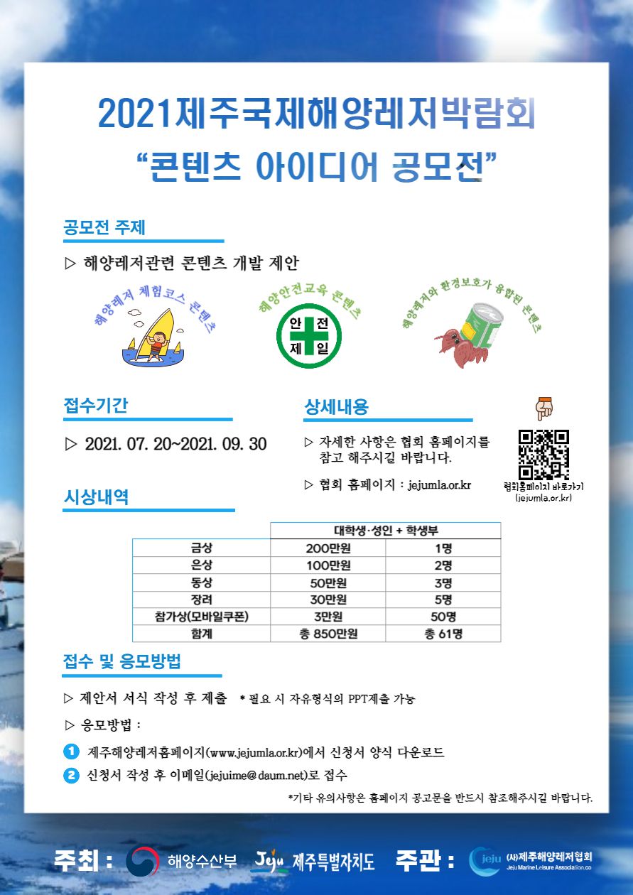 - 시상 일정 : 2021 제주국제해양레저박람회 개막식에 공모전 시상식 예정
