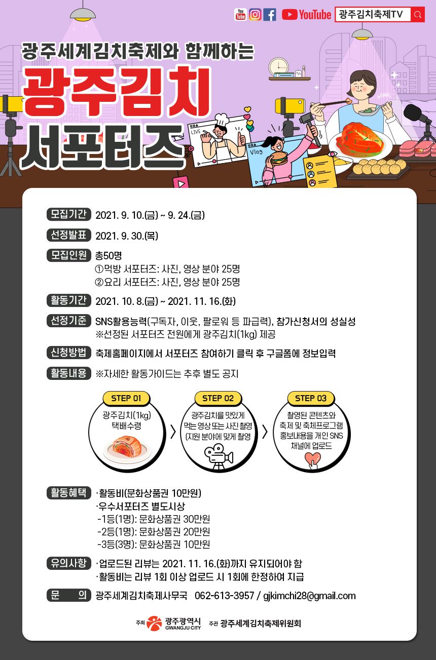 - 제28회 광주세계김치축제 기간 중 축제 프로그램에 참여하고 축제를 알리는 광주김치 서포터즈를 다음과 같이 모집하오니 많은 관심과 참여를 바랍니다.