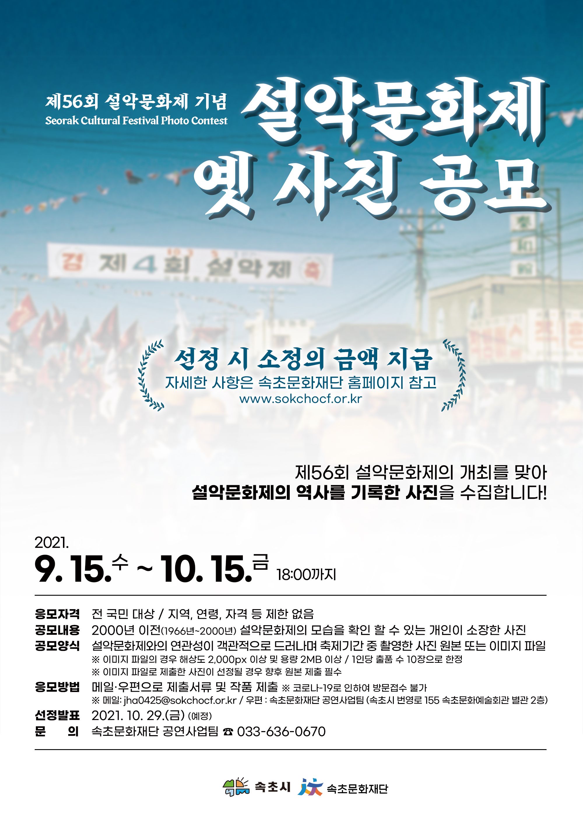(재)속초문화재단에서는 제56회 설악문화제의 개최를 맞아 설악문화제의 역사를 기록한 사진을 수집하고자 아래와 같이 「설악문화제 옛 사진 공모」를 공고하오니, 많은 관심과 참여 부탁드립니다.