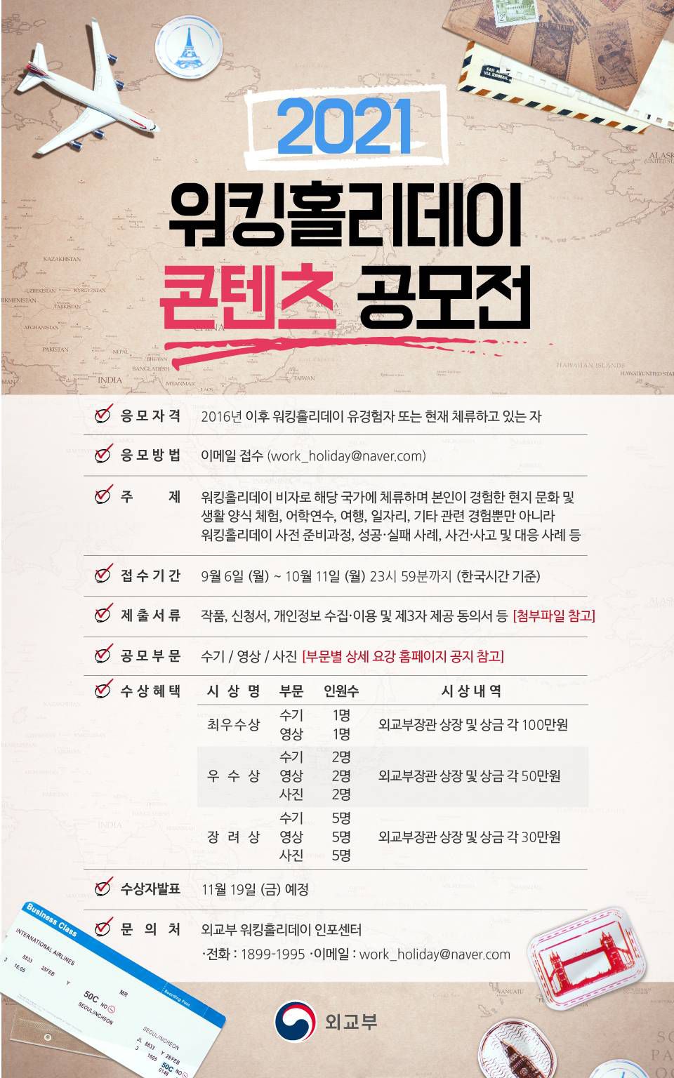○ 문의 : 1899-1995, +82-70-7703-1792 (workingholiday@mofa.go.kr)