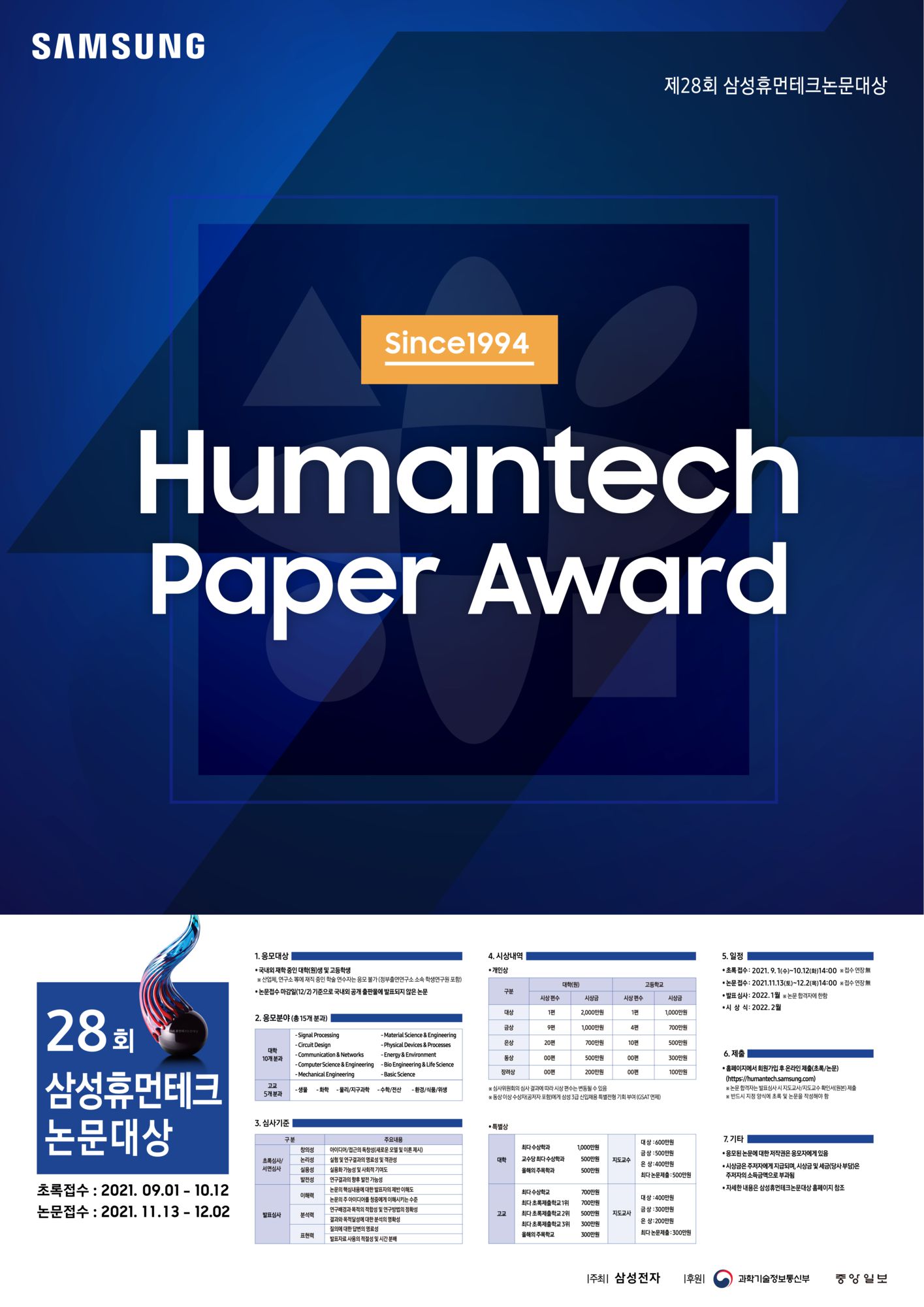 삼성전자는 미래 과학한국을 이끌어갈 창의적이고 도전적인 젊은이들을 발굴하고 학교 내 연구 분위기 활성화와 기술을 중시하는 사회 분위기 조성을 위해 1994년 삼성휴먼테크논문대상을 제정하였습니다.