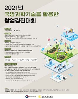 2021 국방과학기술 대제전 『국방과학기술을 활용한 창업경진대회』개최를 다음과 같이 공고하오니 많은 관심과 참여를 바랍니다.