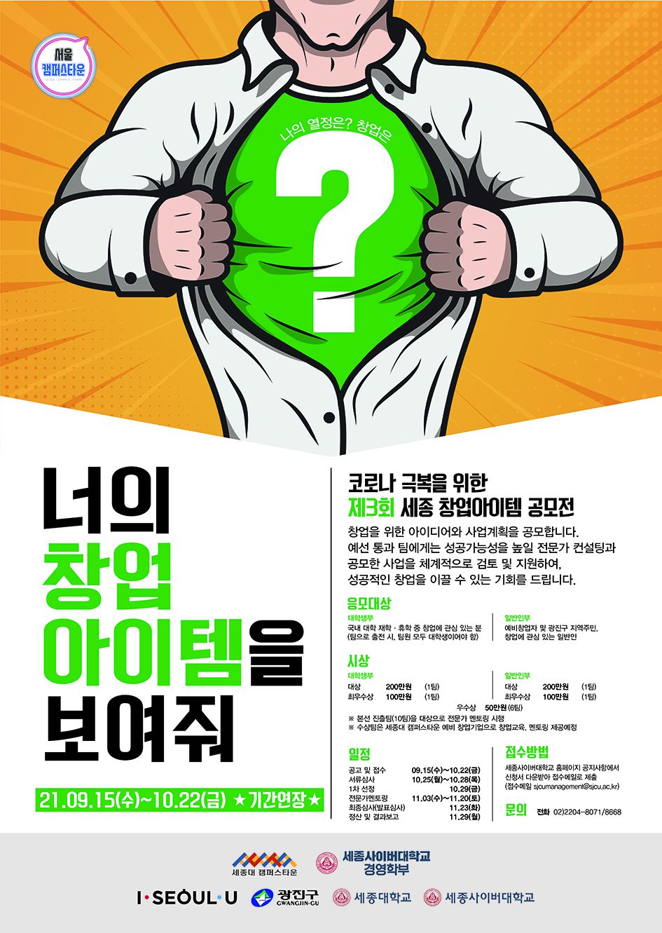 코로나 극복을 위한 「제3회 세종 창업아이템 공모전」 신청일자가 연장되었습니다. 명절 및 시험기간과 겹치는 등 접수 기간이 기존 일정에 비해 짧아 아쉽다는 의견이 많았습니다. 이에 더 많은 분들에게 참여 기회를 제공하는 것은 물론, 참신하고 기발한 창업아이템을 공모하고자 부득이하게 신청 및 접수기간을 일주일 연장하게 되었습니다. 창업에 관심 있는 분들의 많은 참여 부탁드립니다.