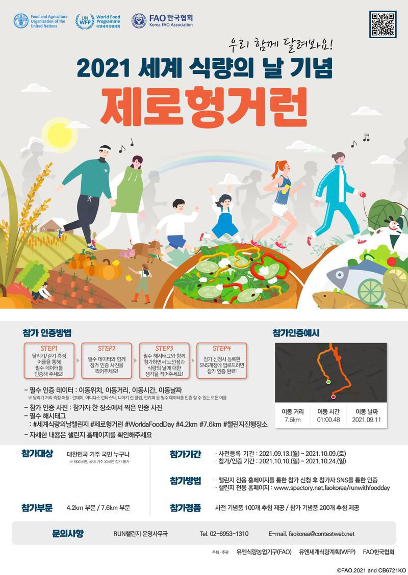 - 기간 내 기반의 거리 측정 기능이 있는 앱을 이용해 4.2km 또는 7.6km* 완주하고 개인 SNS에 인증샷 및 관련 내용, 장소, 세계 식량의 날에 대한 생각 등을 태그로 업로드