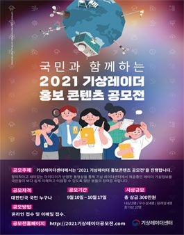 - 제출된 작품의 저작권은 응모자에게 있으며, 수상작은 공모의 취지․목적을 달성하기 위해 상업적 용도가 아닌 공공 정책 홍보 목적에 한해 기상청 기상레이더센터가 온․오프라인 매체를 통해 홍보에 활용할 수 있음